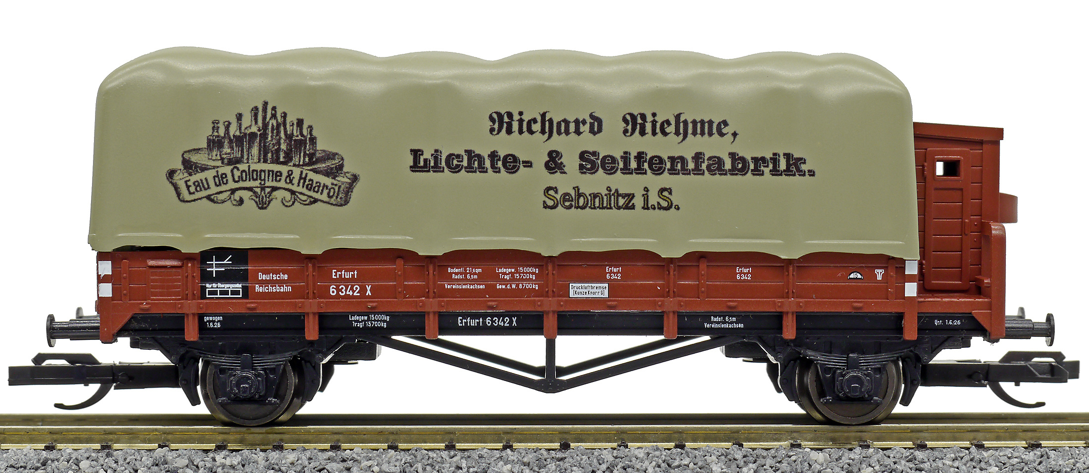 | nízkostěnný nákladní vůz s plachtou „Seifenfabrik Riehme“ |
