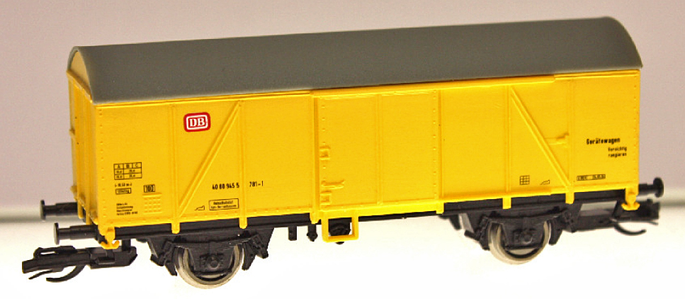 | krytý nákladní vůz žlutý s šedou střechou „DB Netz“ |