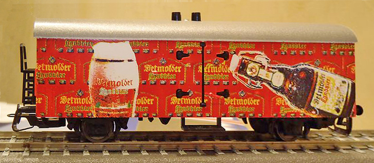| nákladní chladící vůz červený se stříbrnou střechou s potiskem „Detmolder Landbier“ |