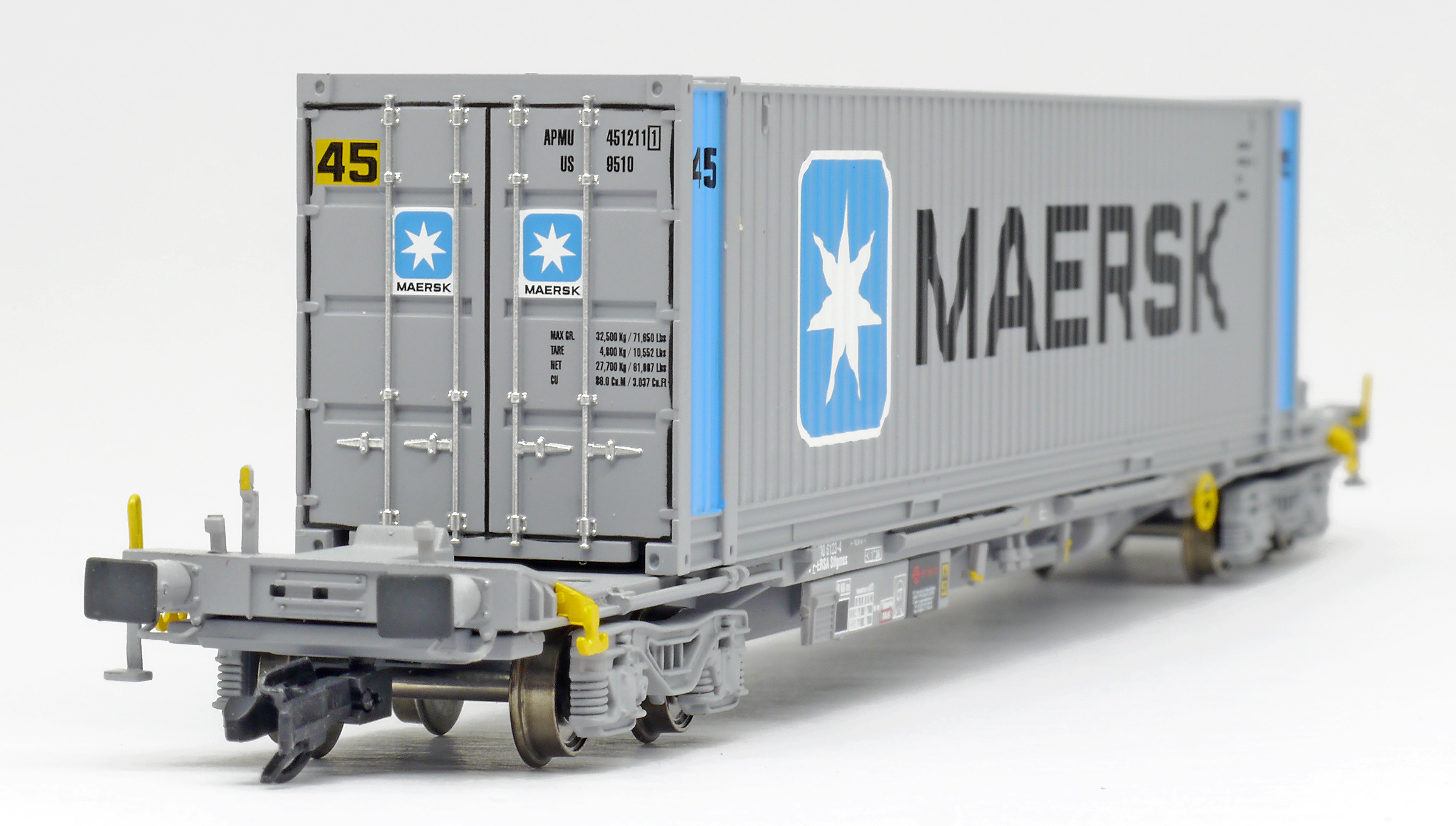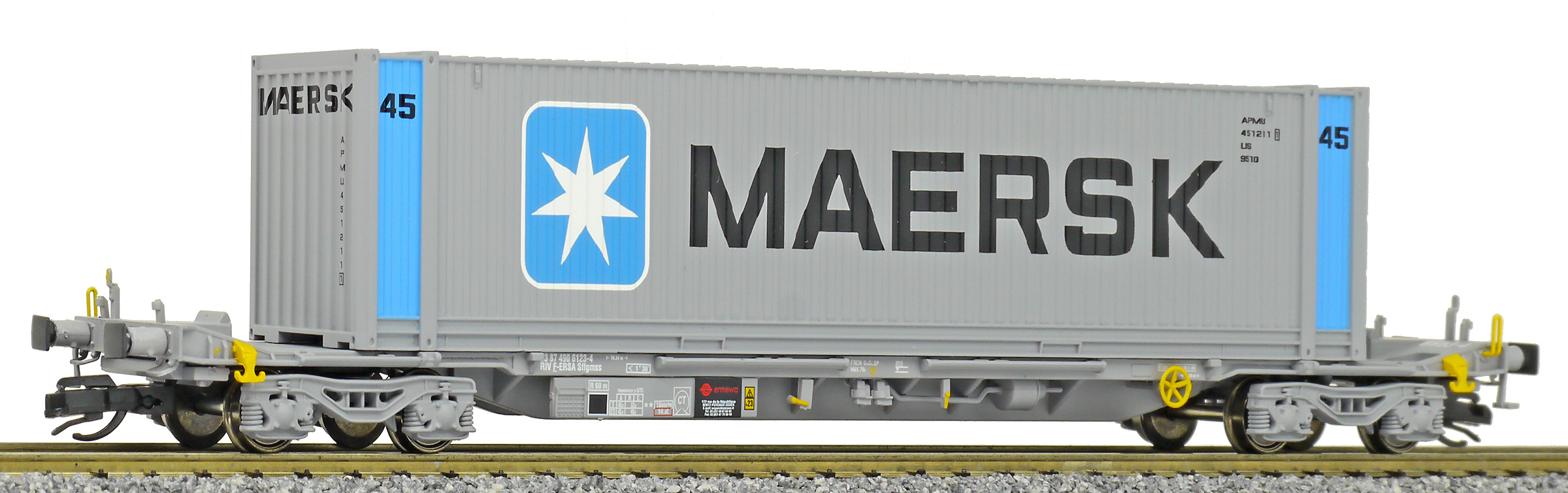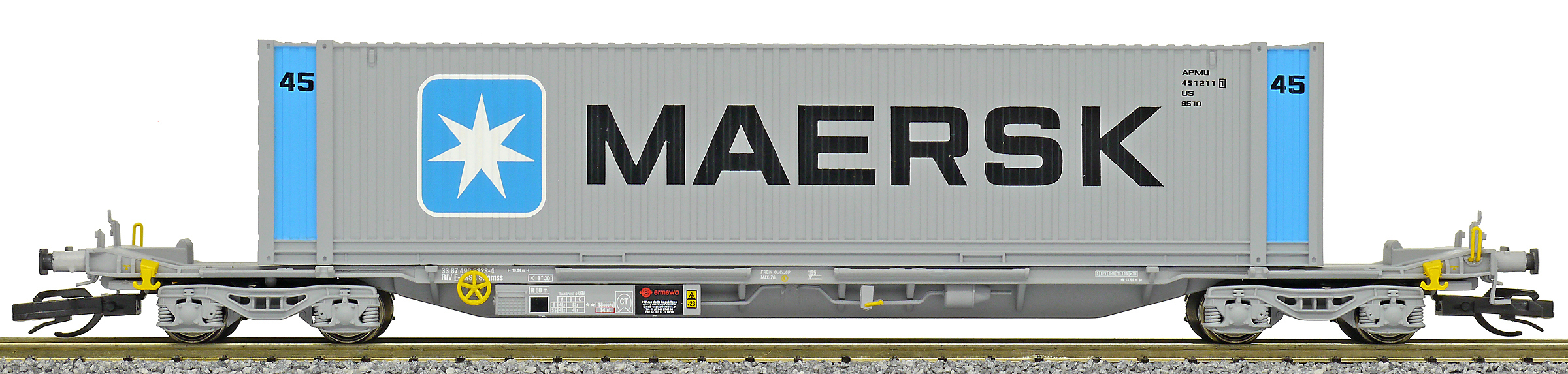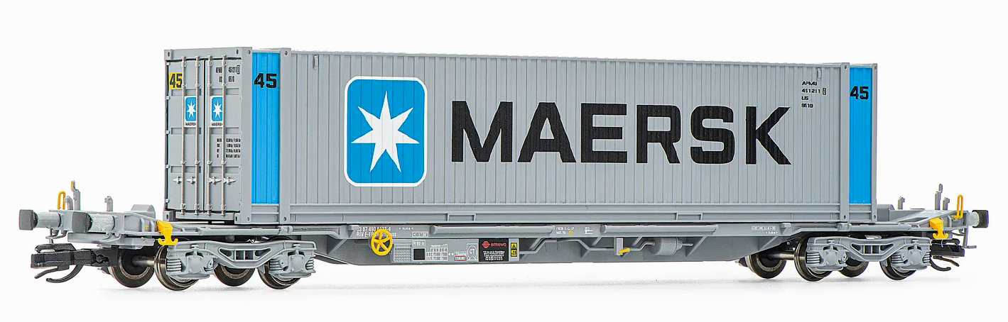 | kontejnerový vůz „IFA” šedý ložený 45' kontejnerem „Maersk” |