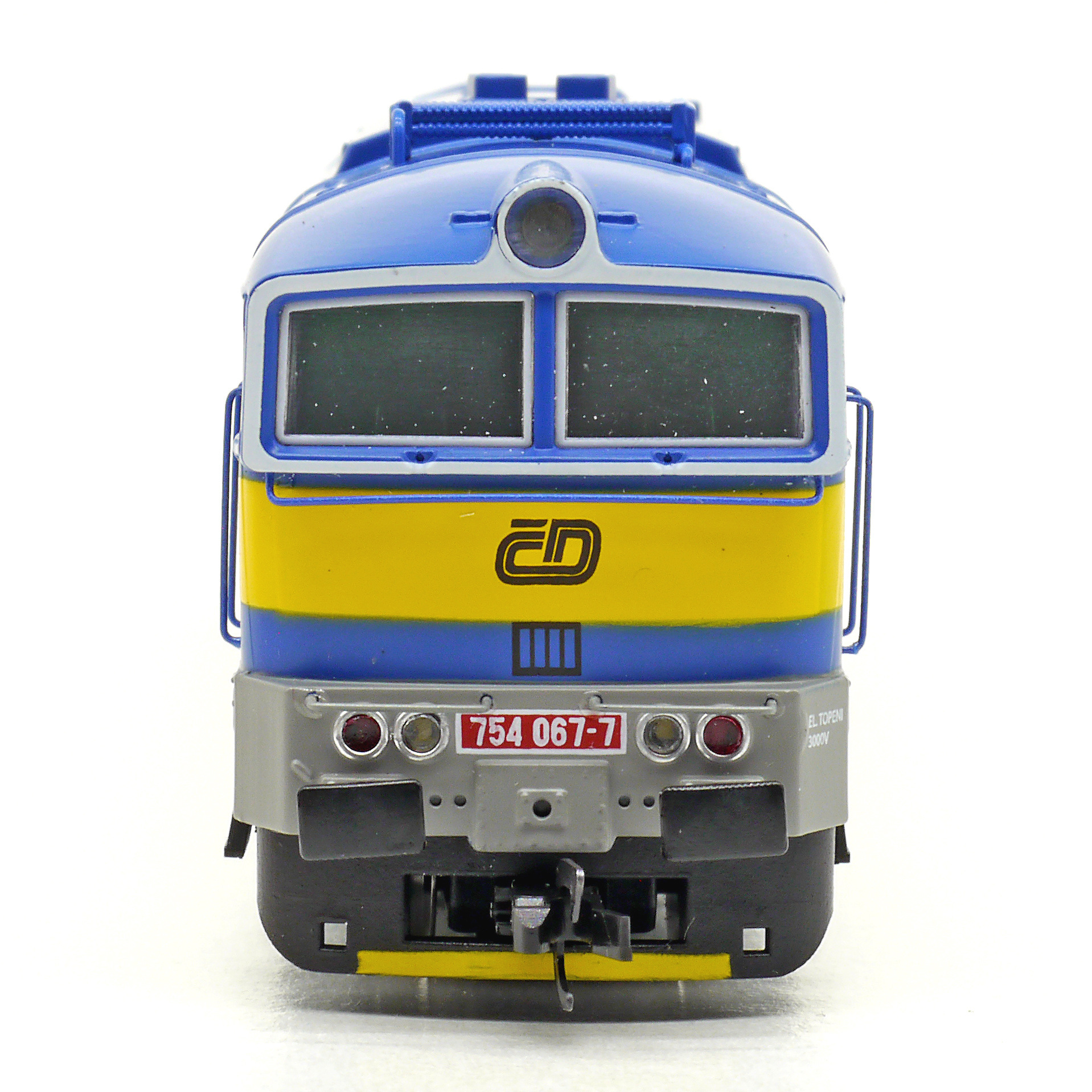 | dieselová lokomotiva modrá s výstražným pruhem, šedý rám |