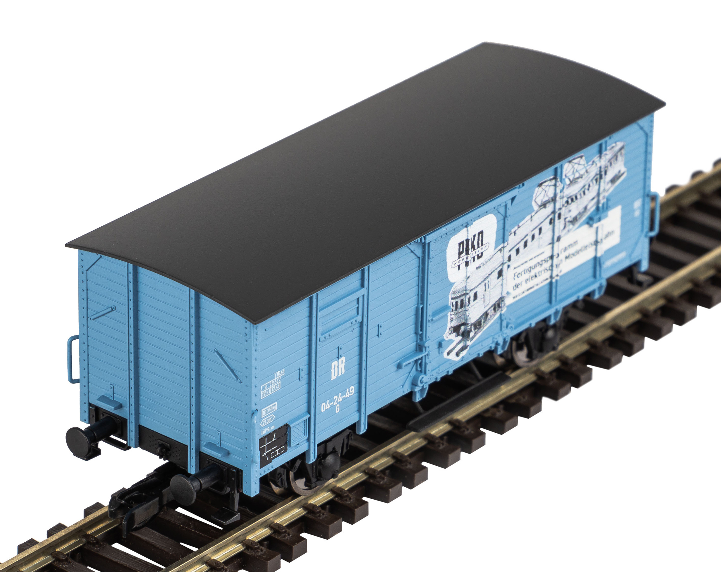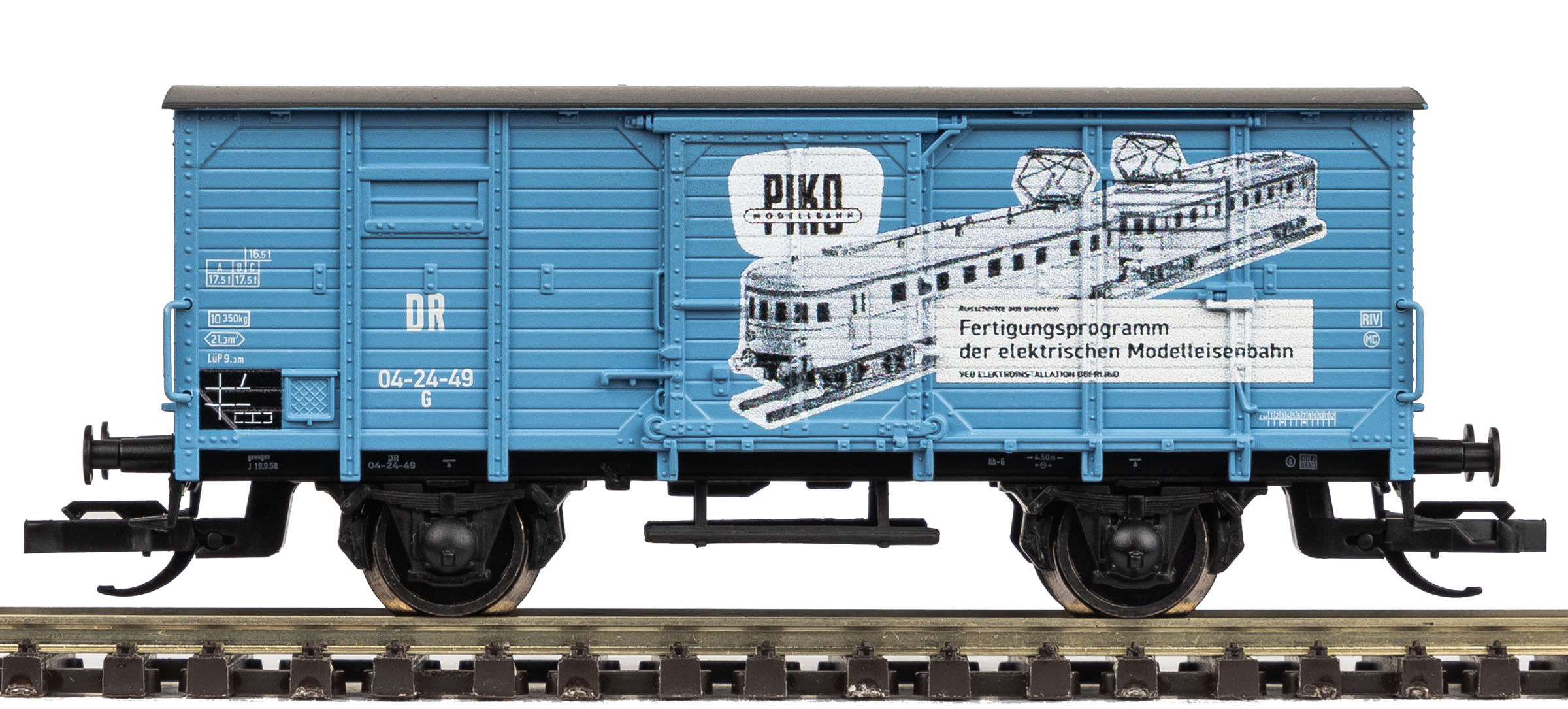 Popis   krytý nákladní vůz modrý s černou střechou a s reklamním potiskem „VEB PIKO“