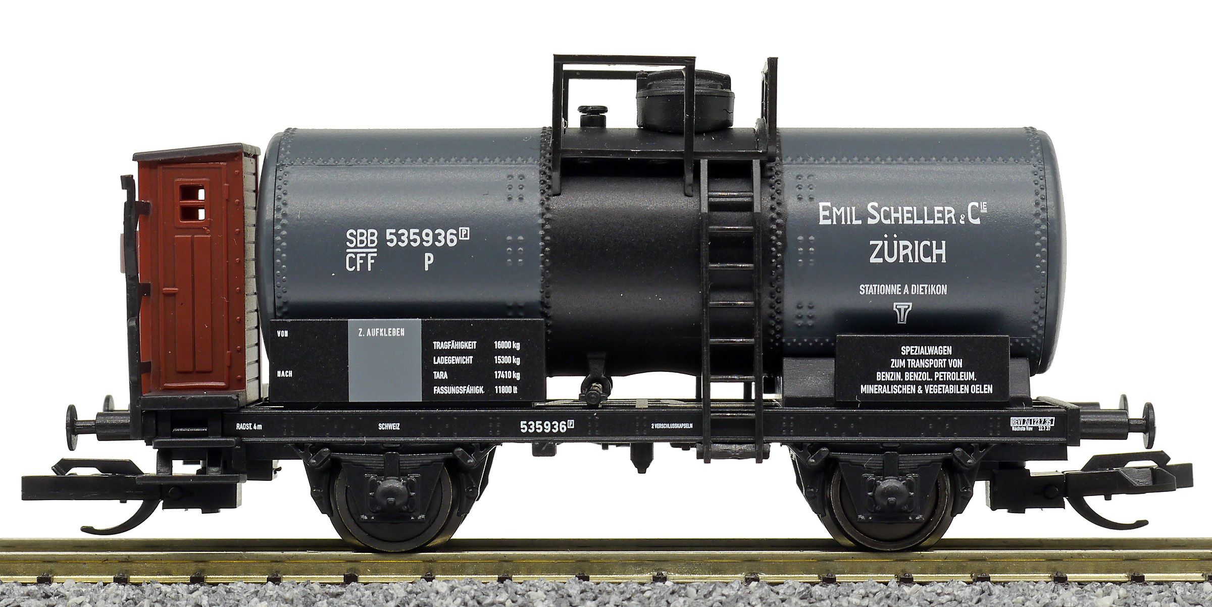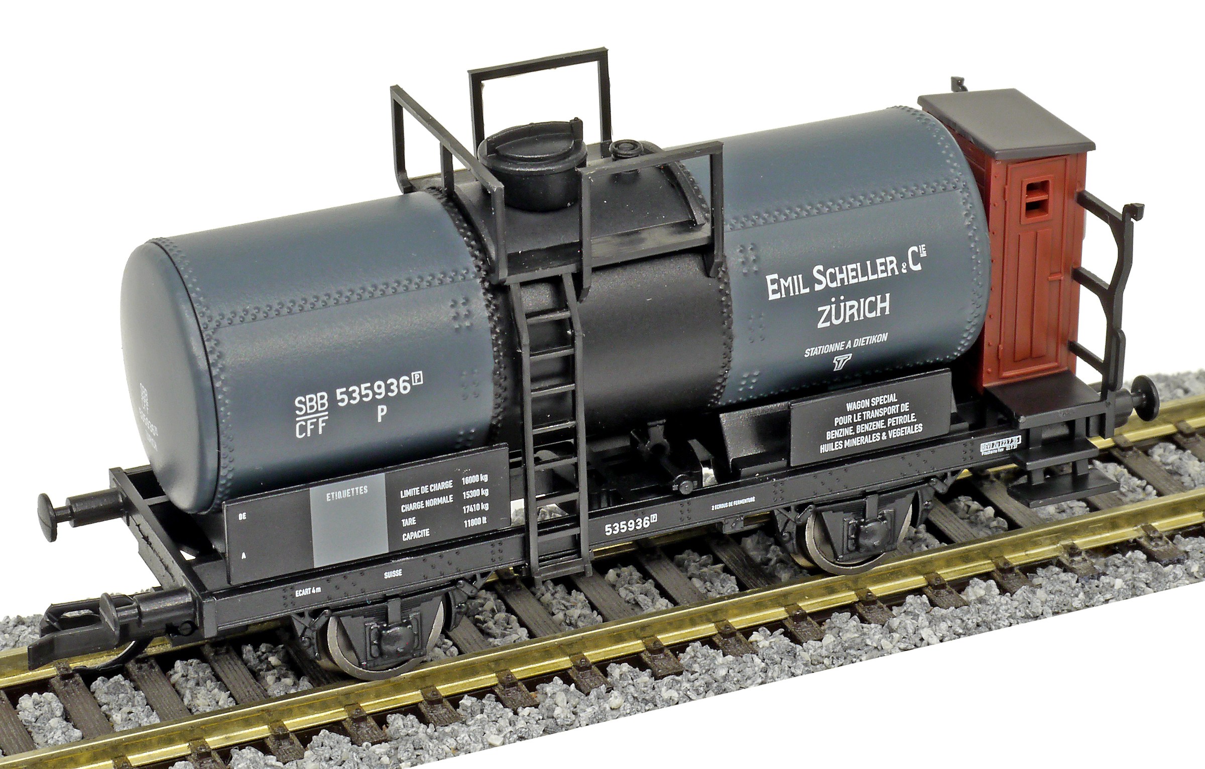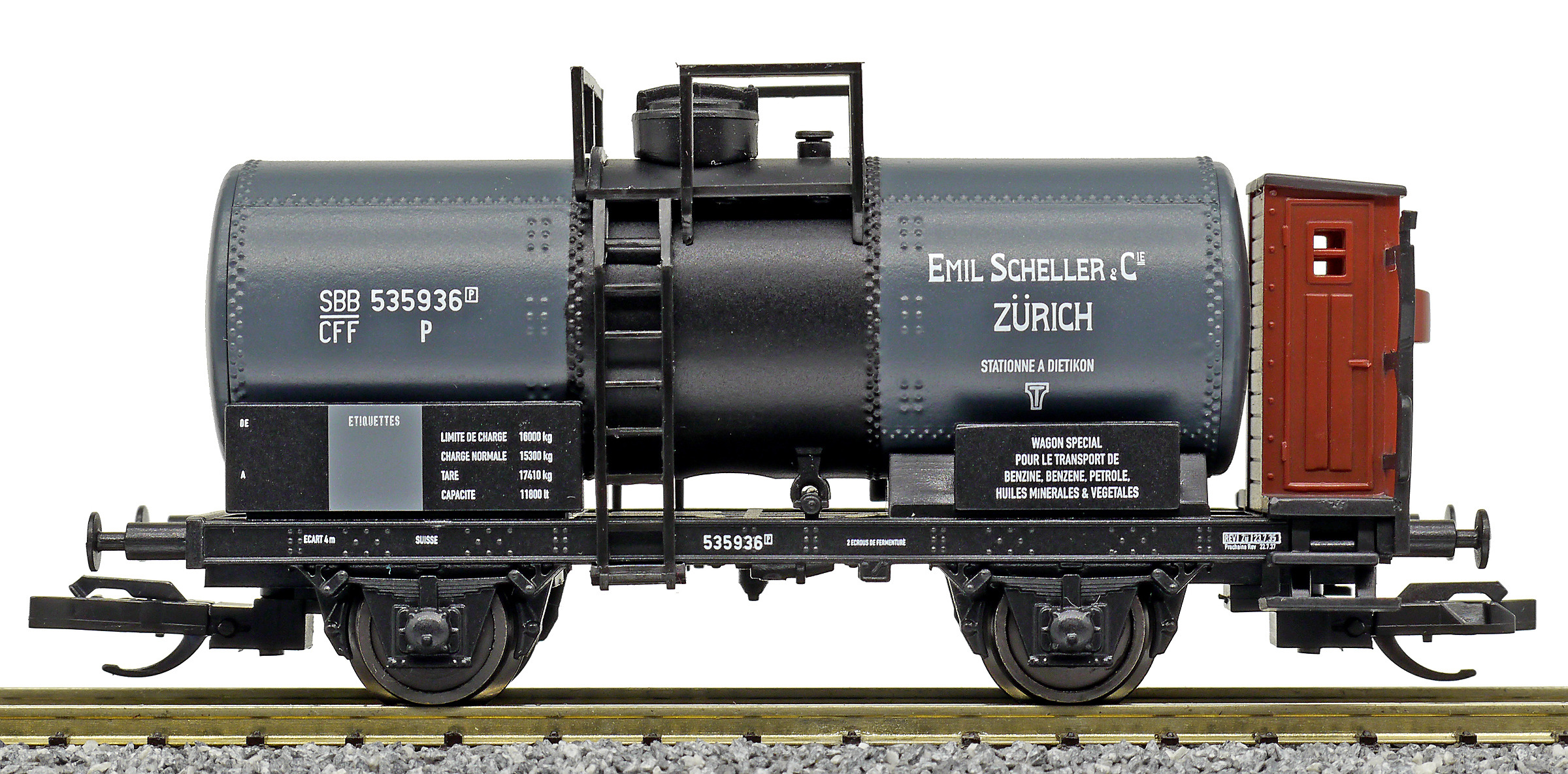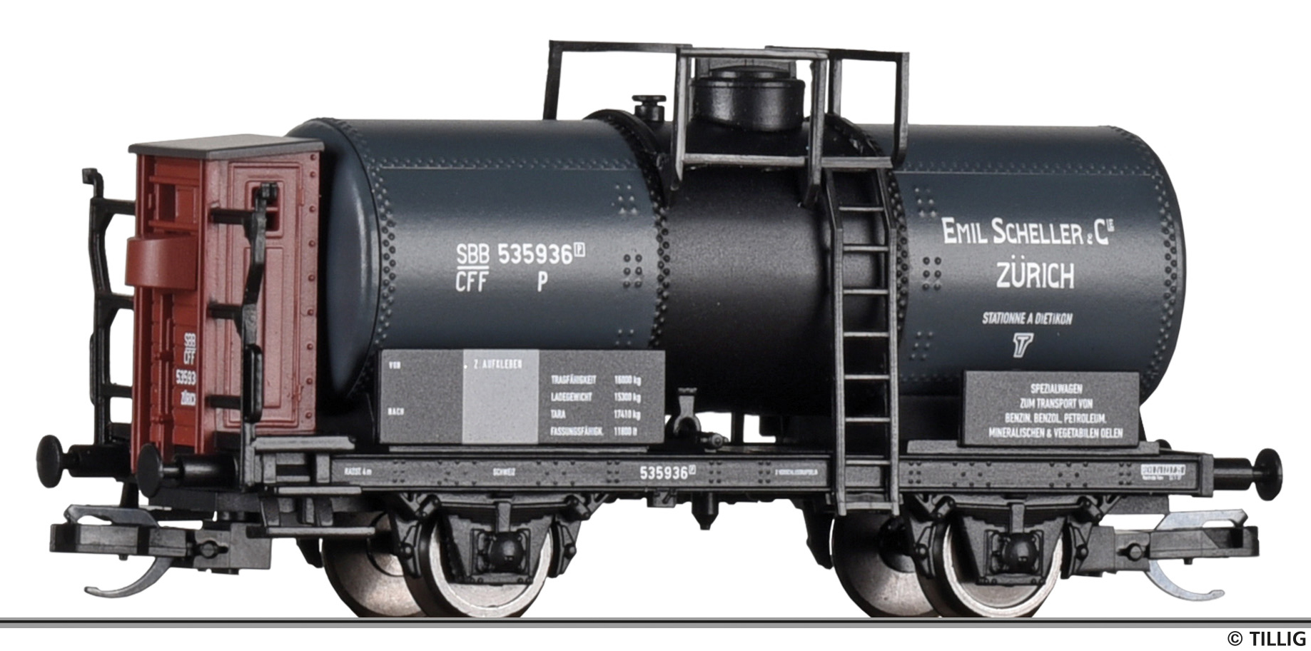 Popis   kotlový vůz tmavě šedý s brzdařskou budkou „E. Scheller & Cie, Zürich“