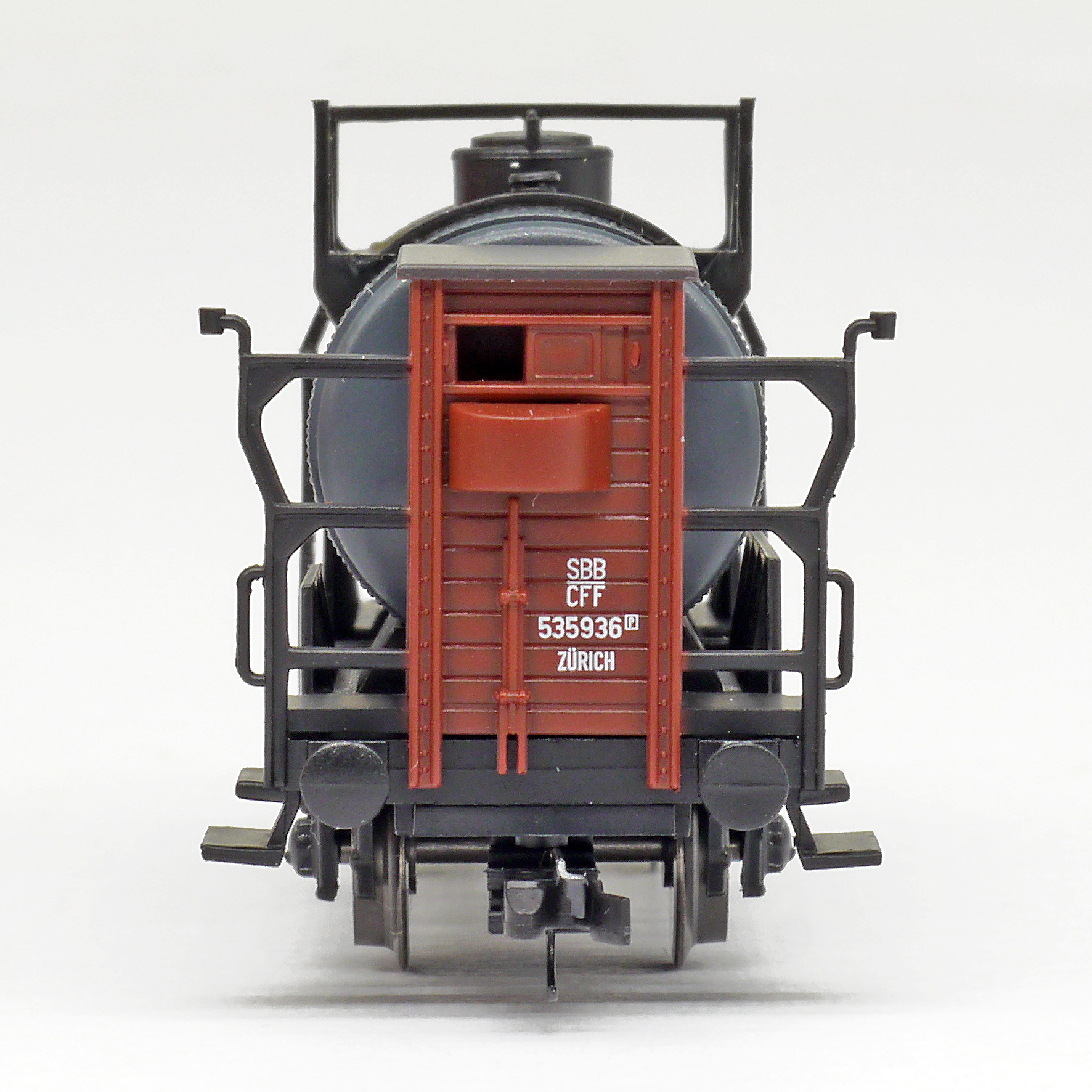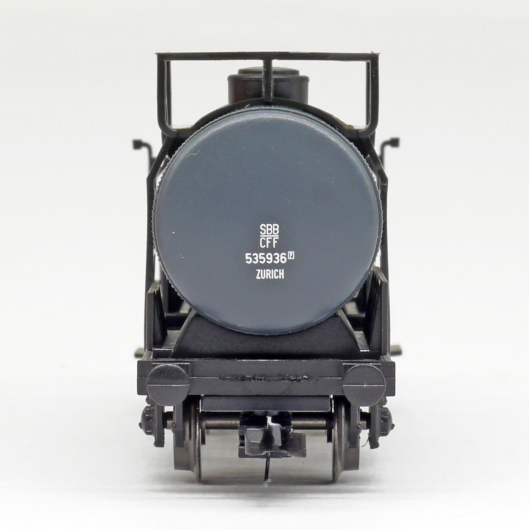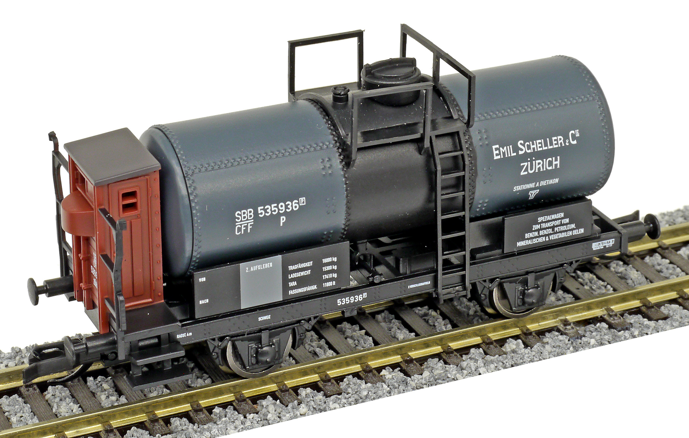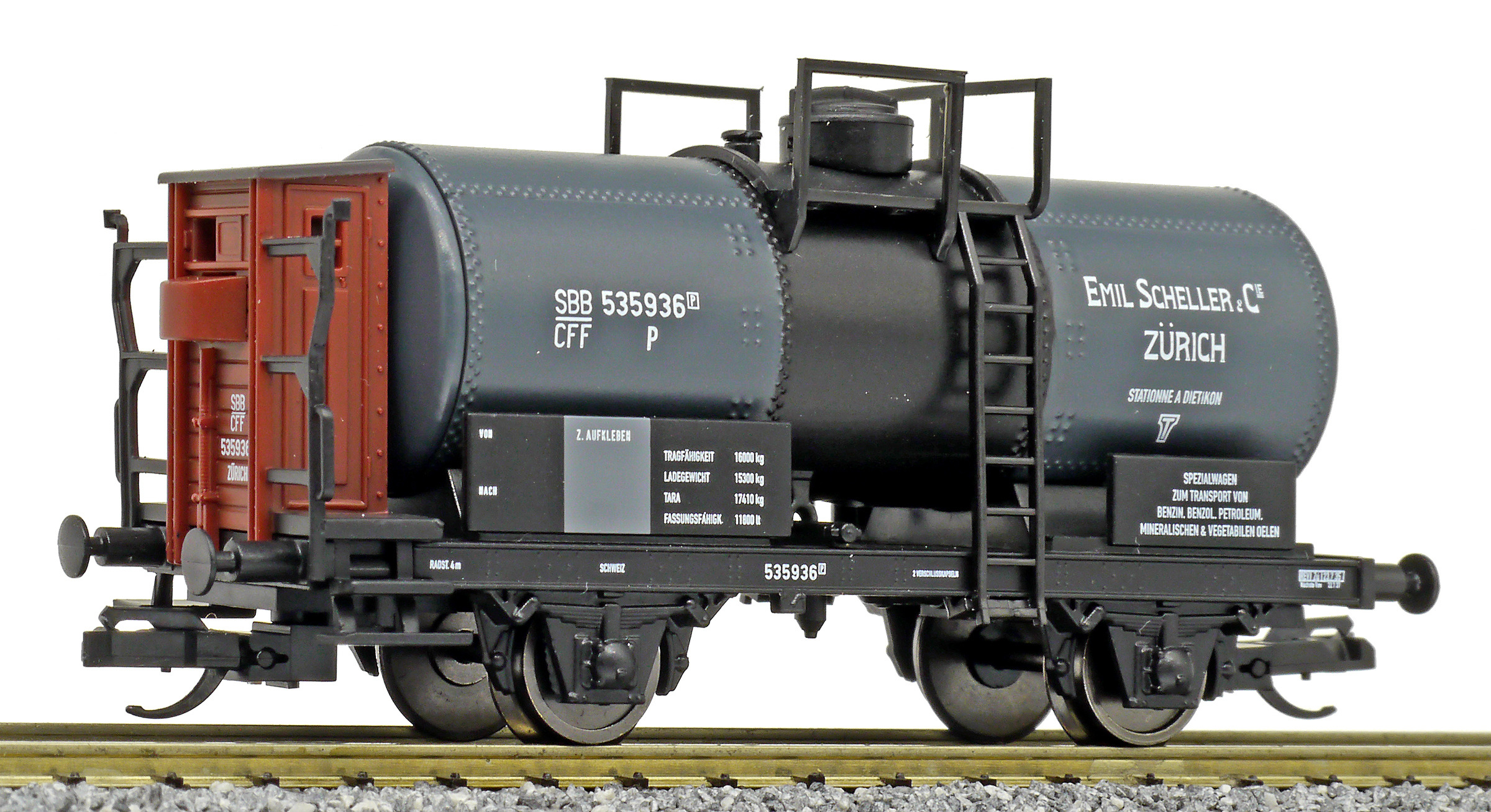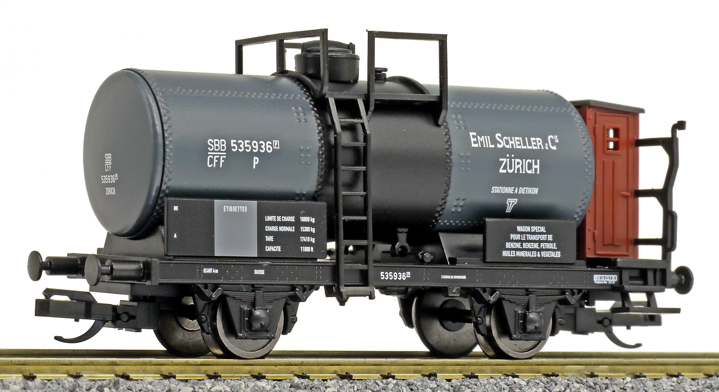 Popis   kotlový vůz tmavě šedý s brzdařskou budkou „E. Scheller & Cie, Zürich“