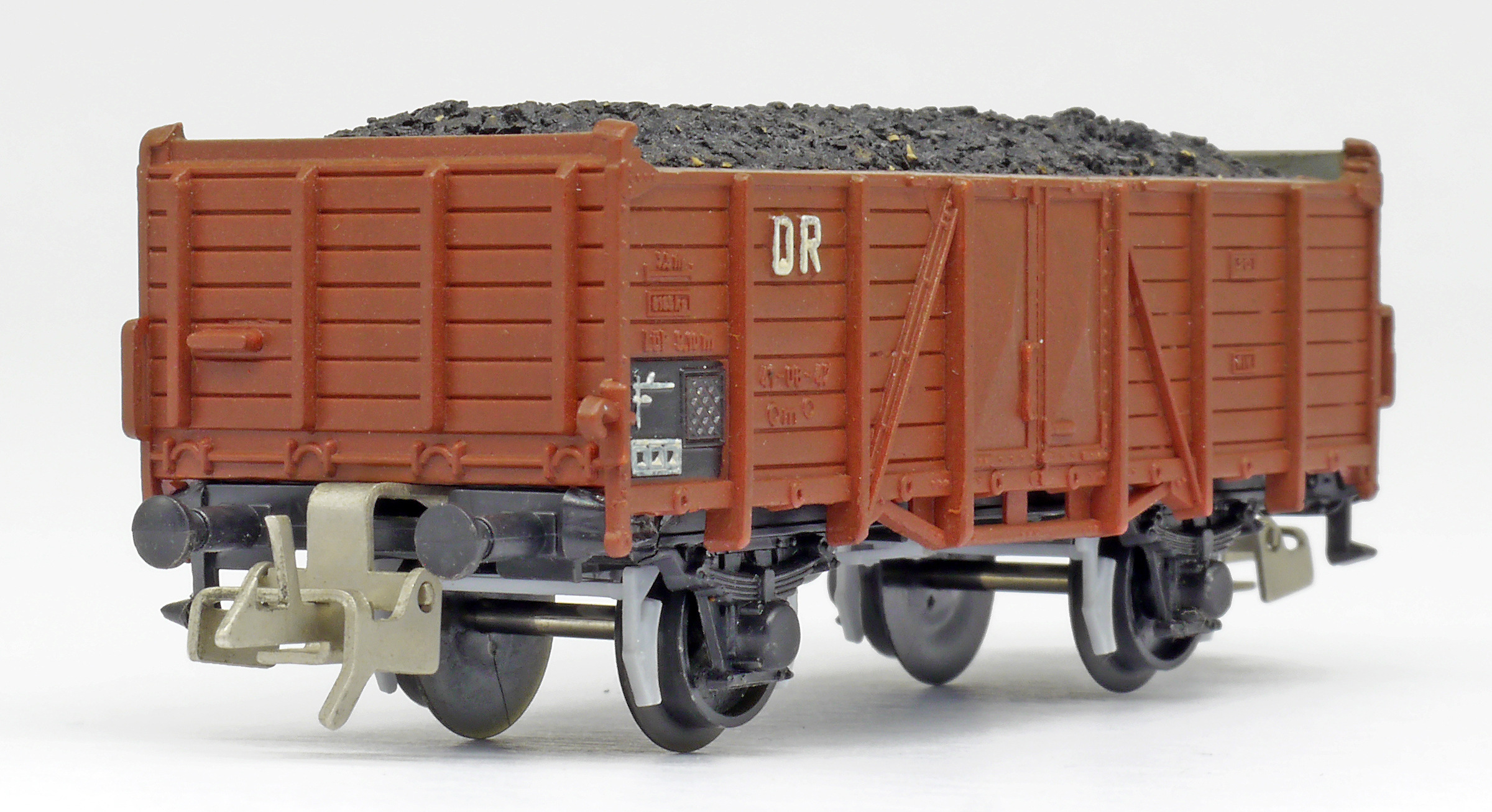 otevřený nákladní vůz červenohnědý ložený uhlím