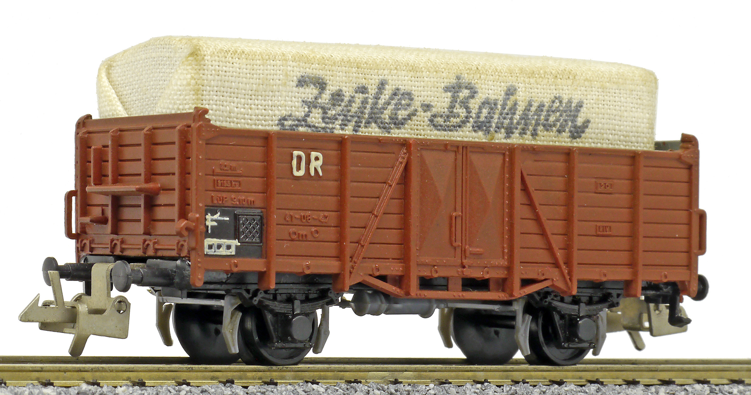 otevřený nákladní vůz červenohnědý s nákladem krytým plachtou „Zeuke-Bahnen“