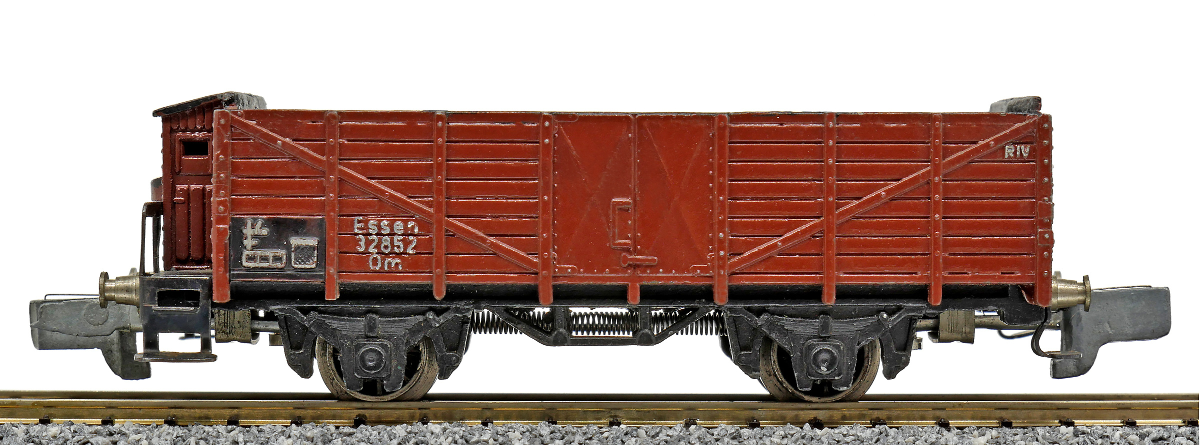 | otevřený nákladní vůz červenohnědý s brzdařskou budkou |