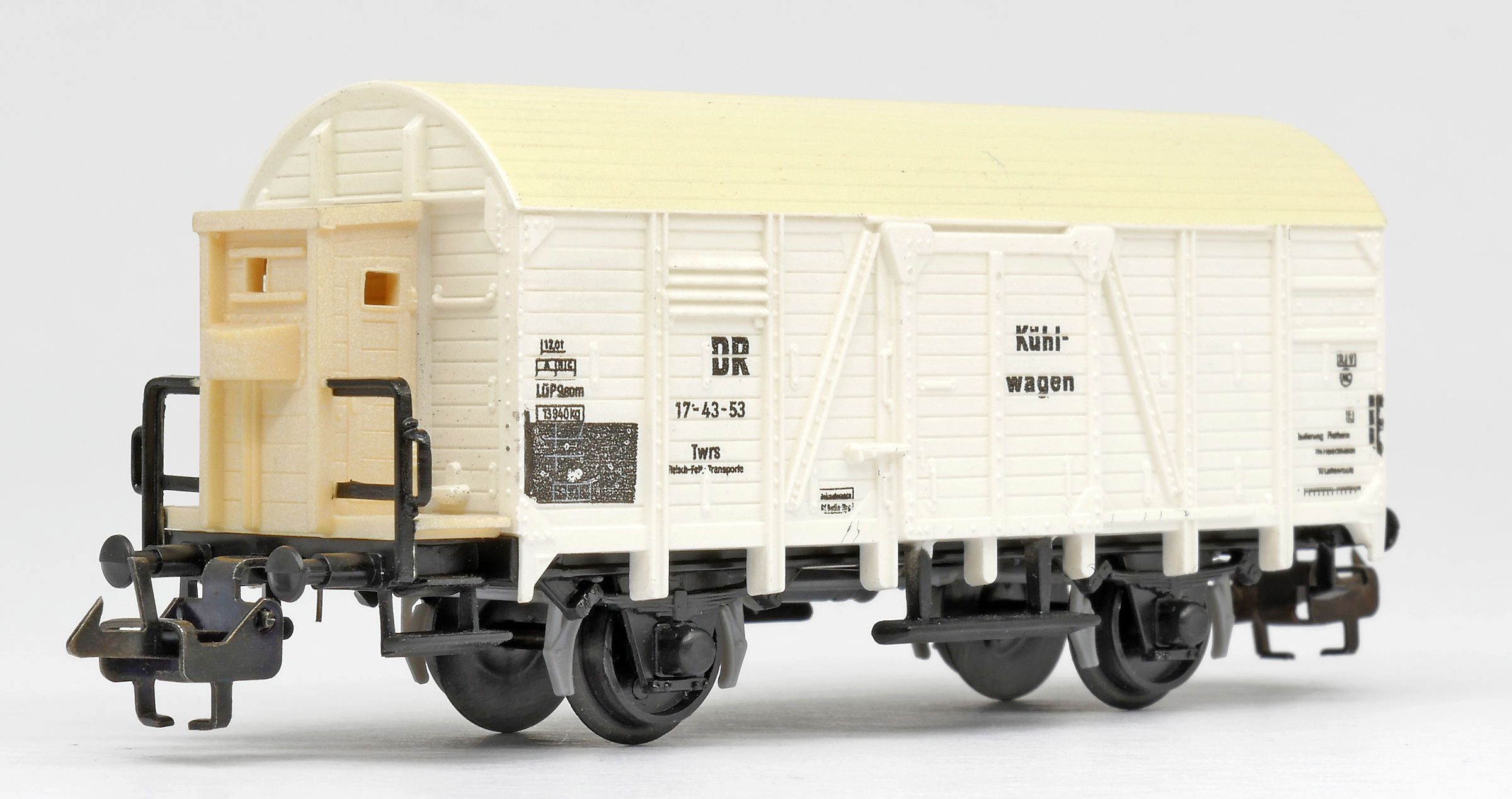 | nákladní chladící vůz bílý s krémovou střechou a s brzdařskou budkou „Kühlwagen“ |