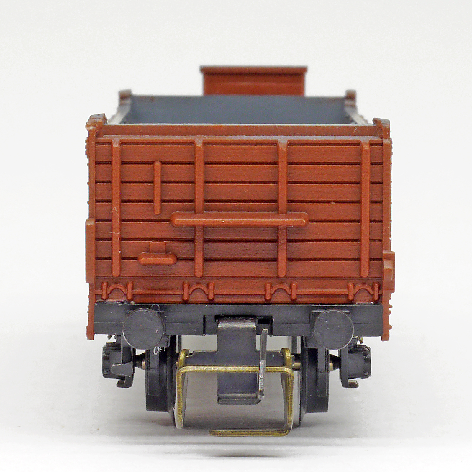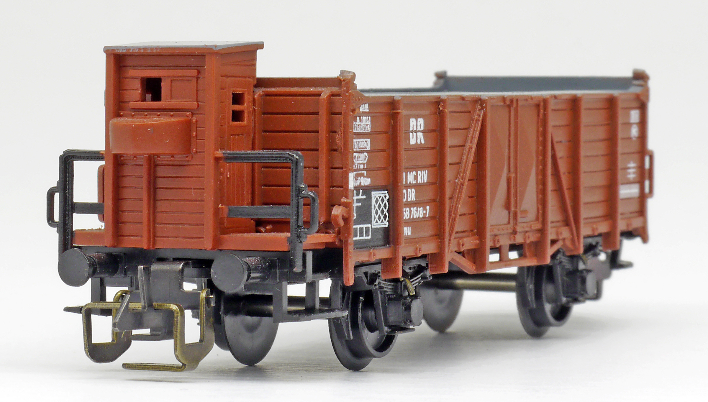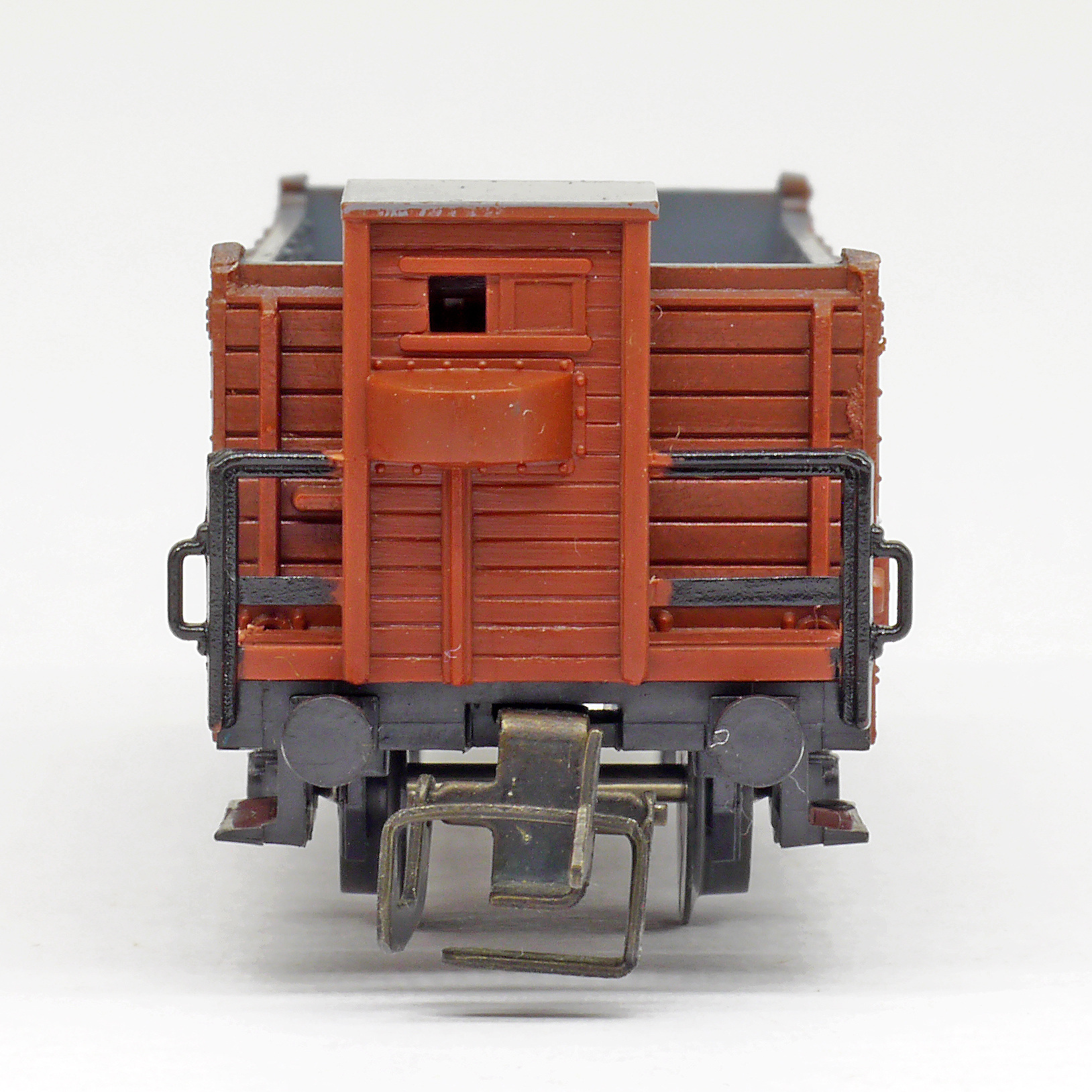 | otevřený nákladní vůz červenohnědý s brzdařskou budkou |