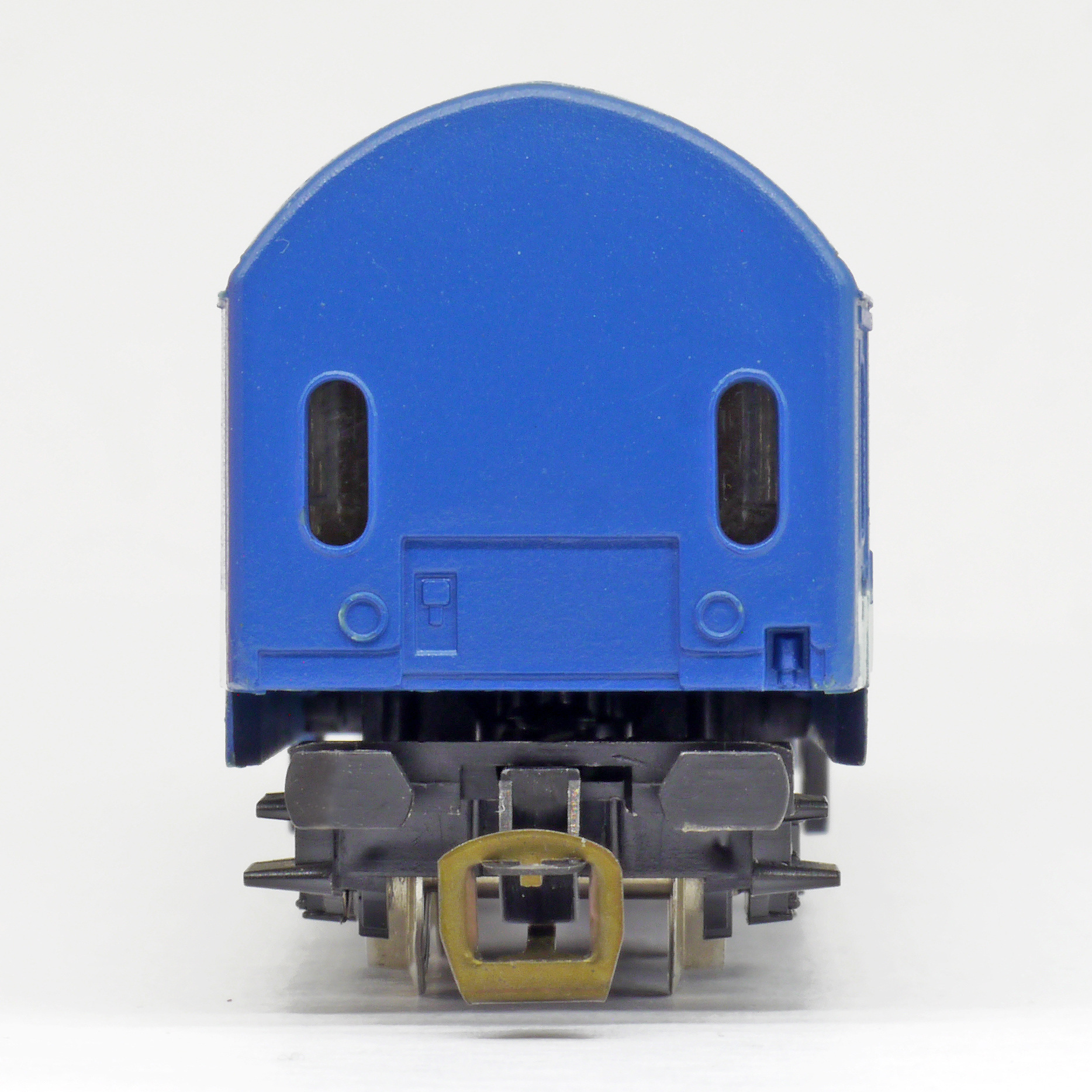 | poštovní vůz modrý s bílým pásem a s šedou střechou |