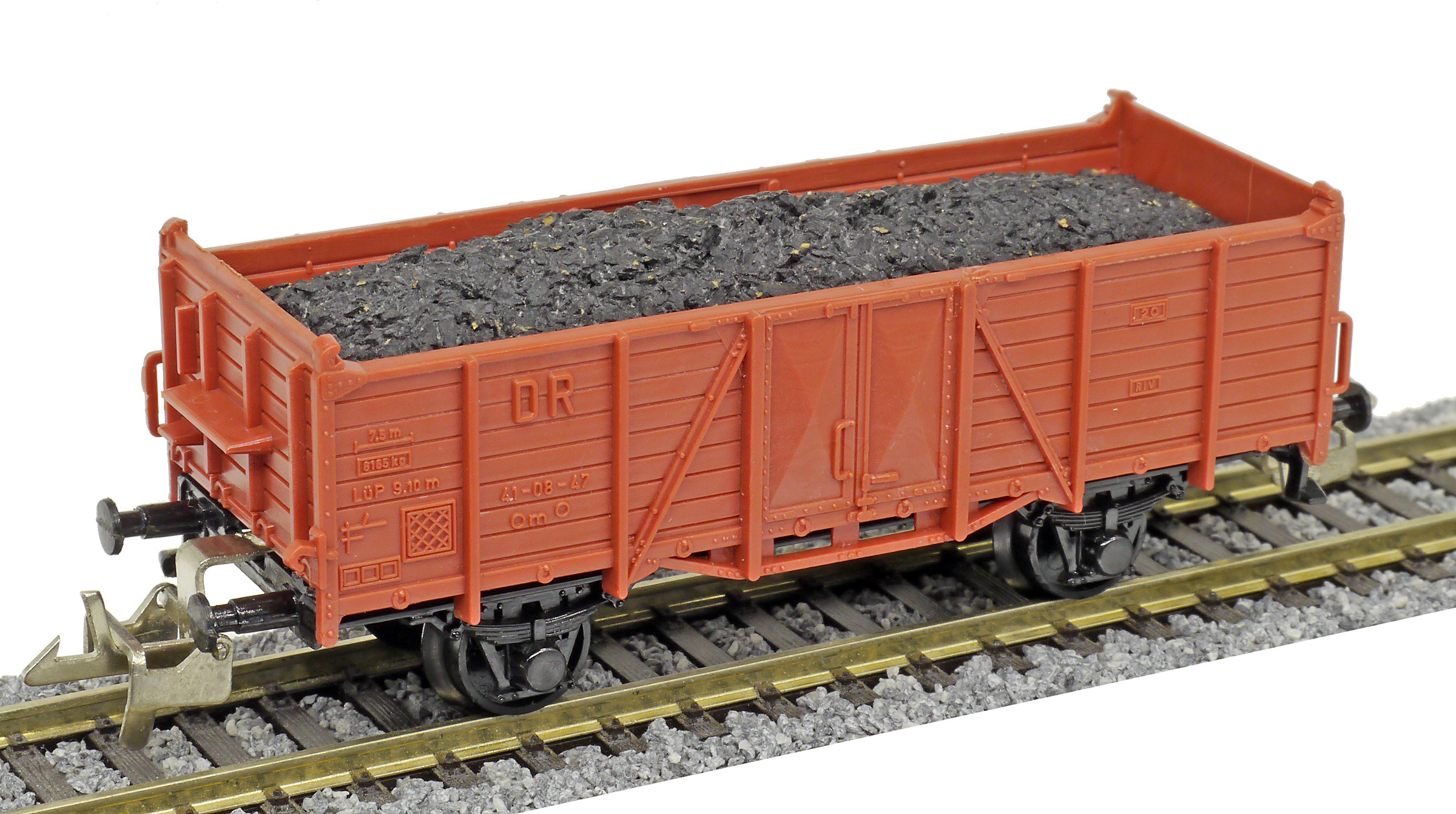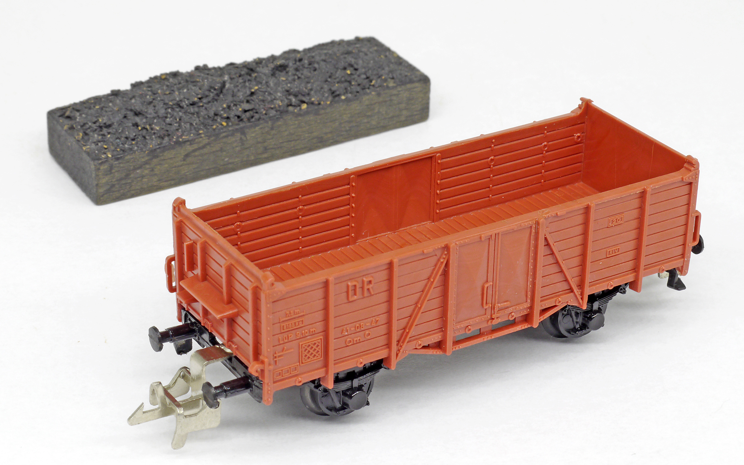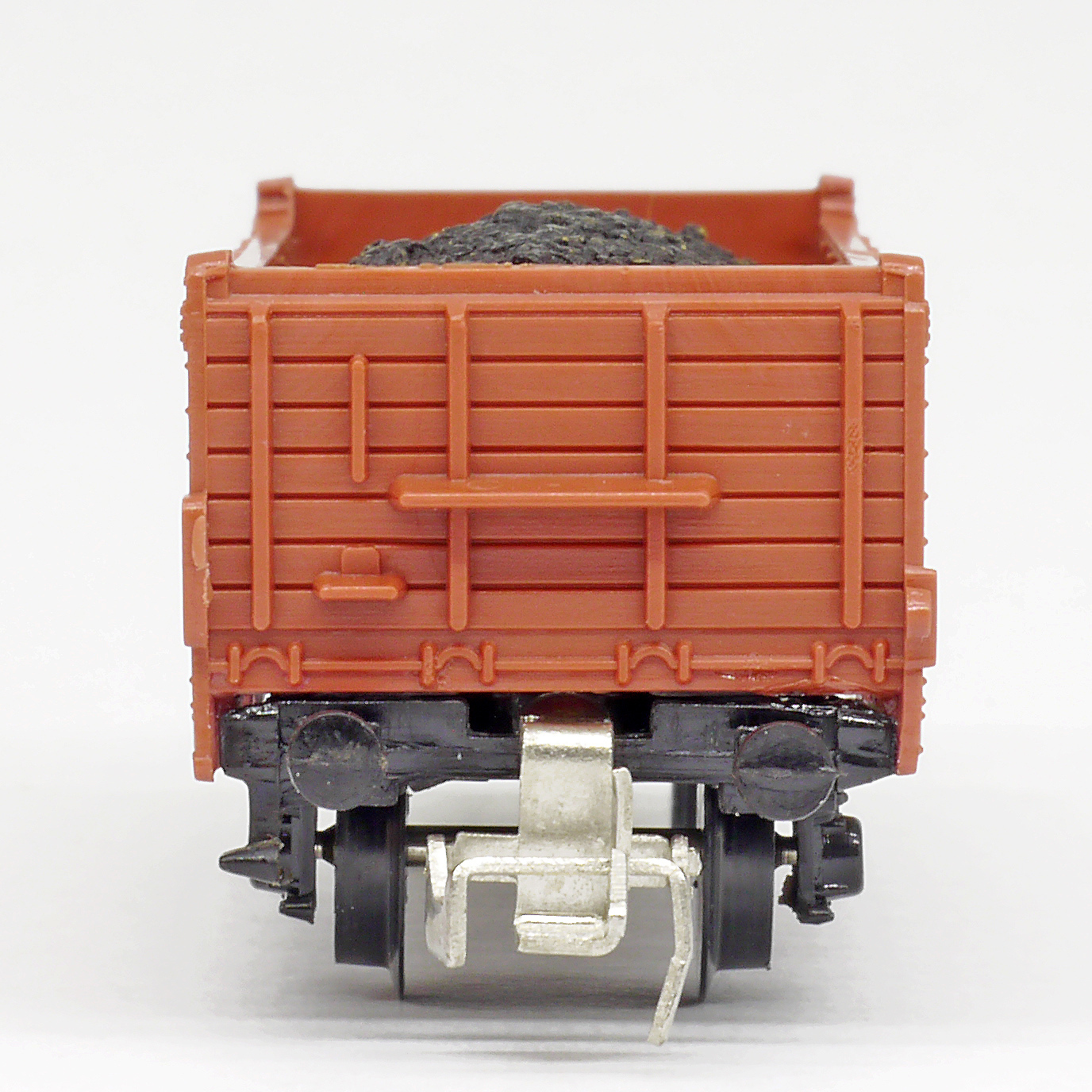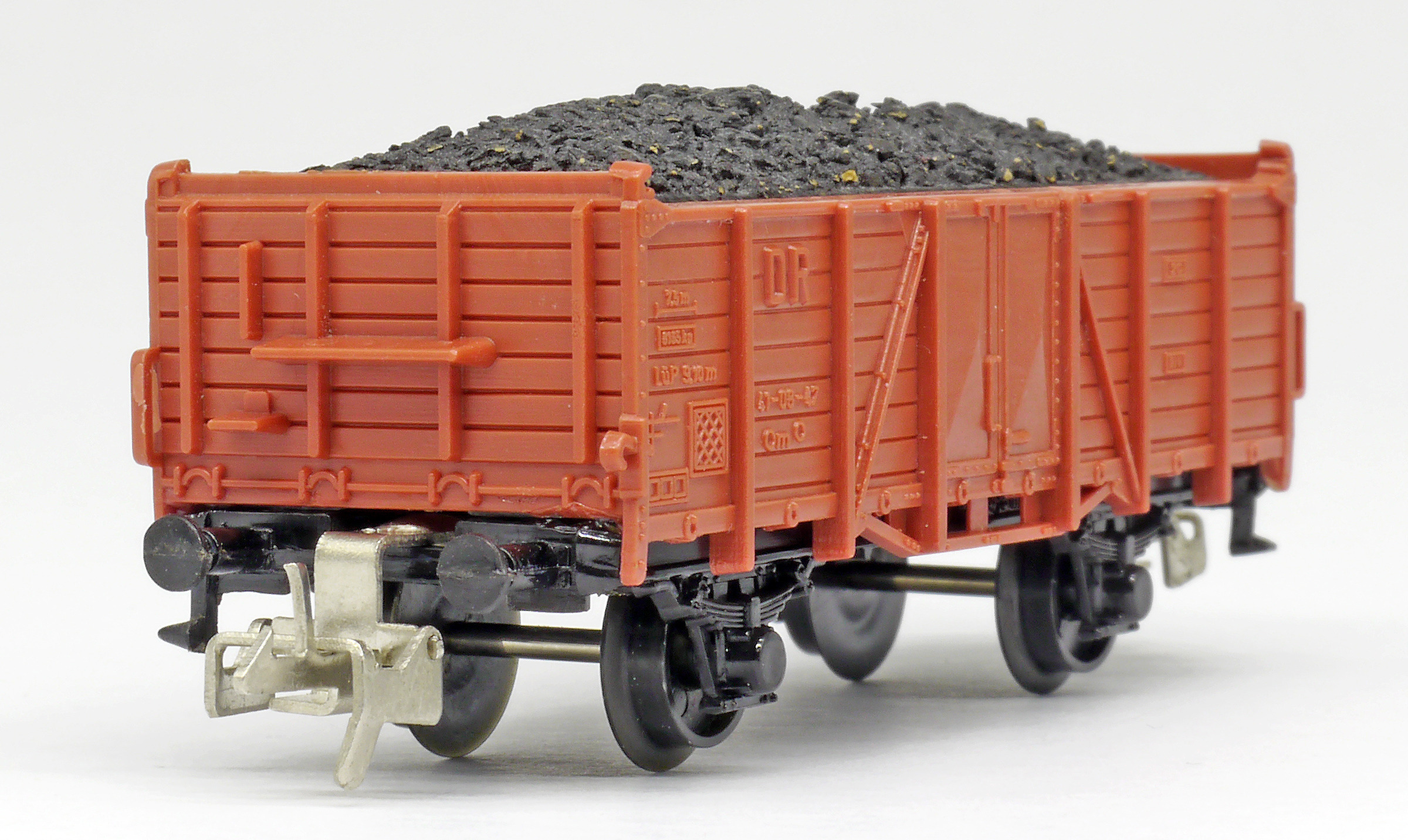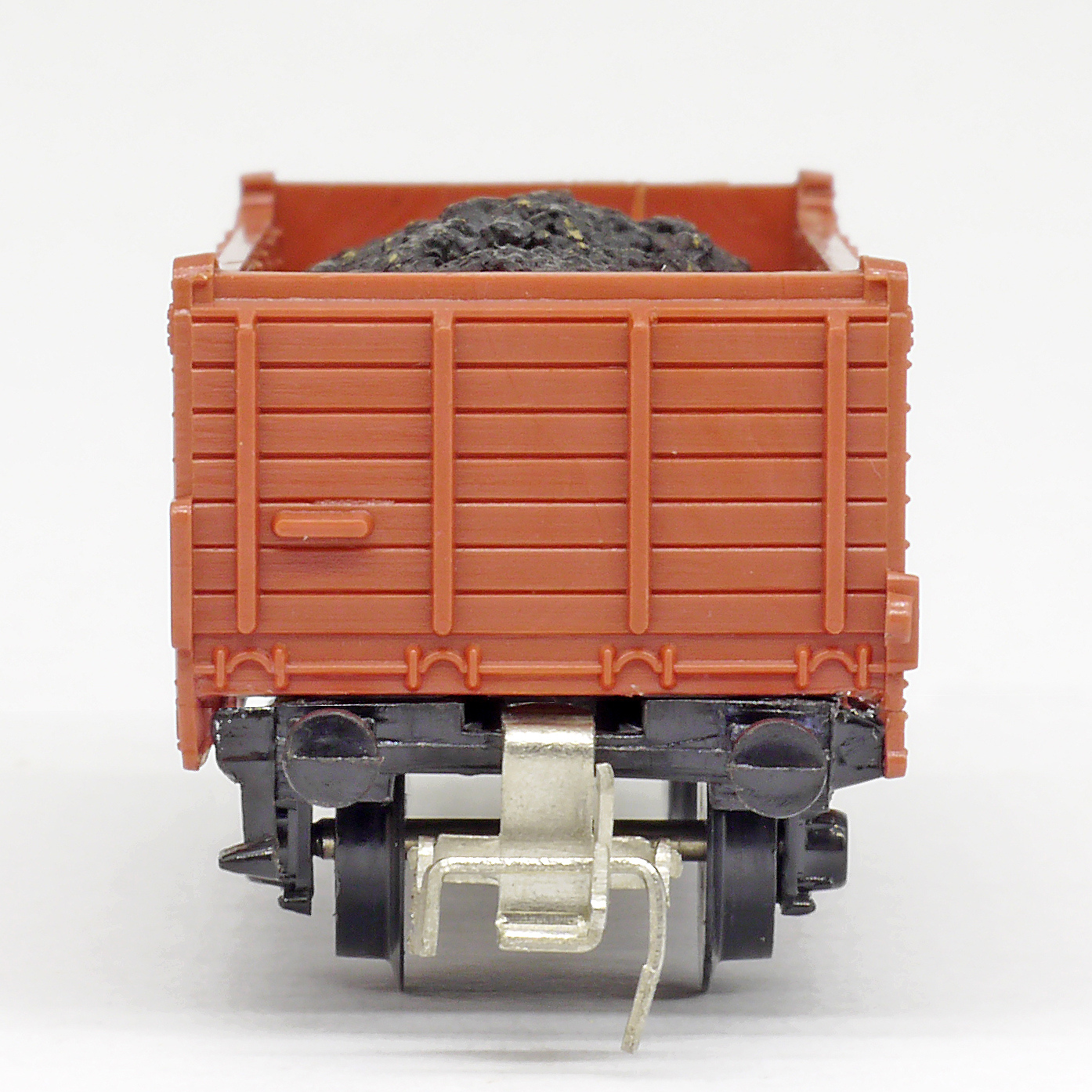 | otevřený nákladní vůz červenohnědý nebo zelený s nákladem uhlí |