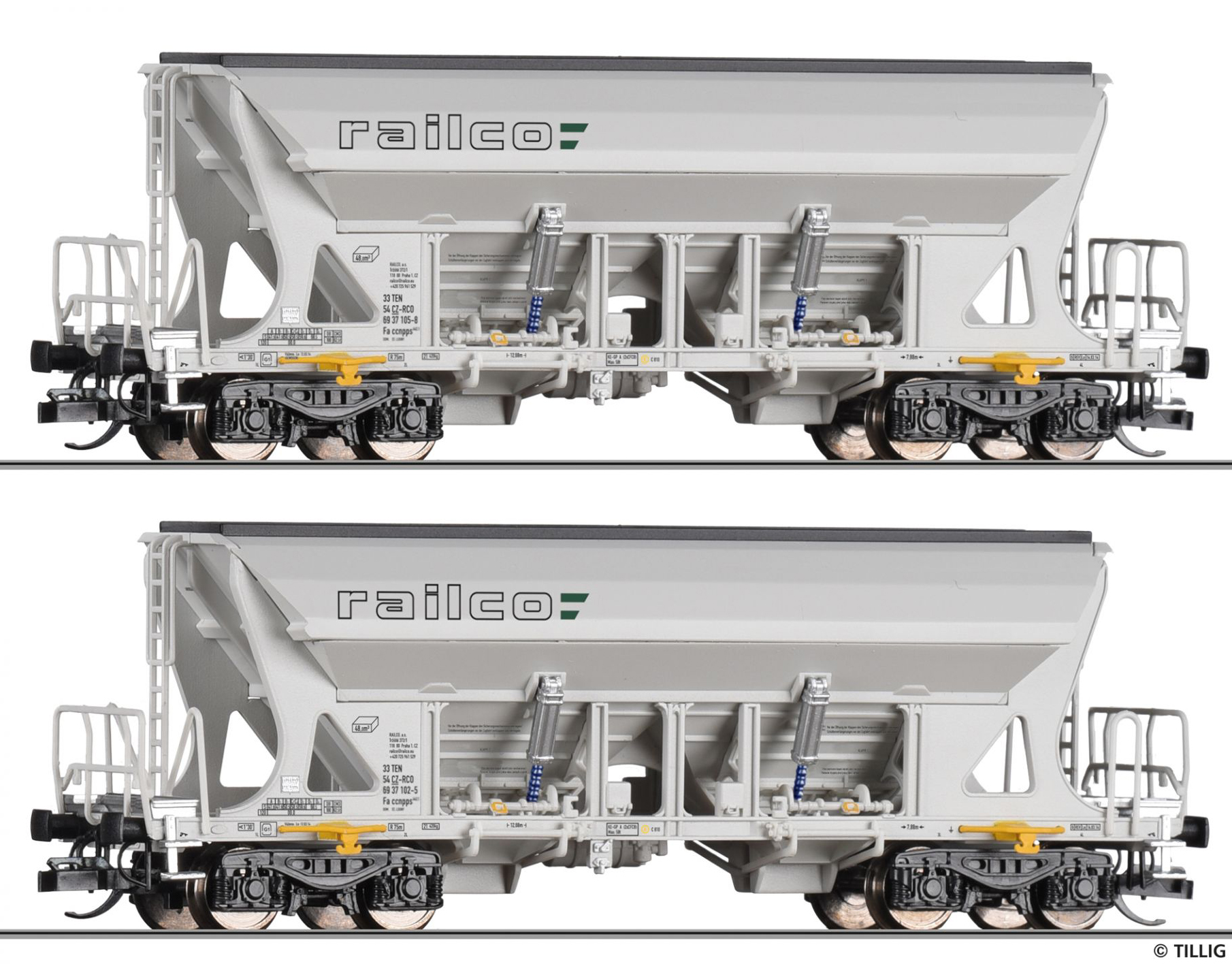 | set dvou šedých nákladních samovýsypných vozů „Railco“ |