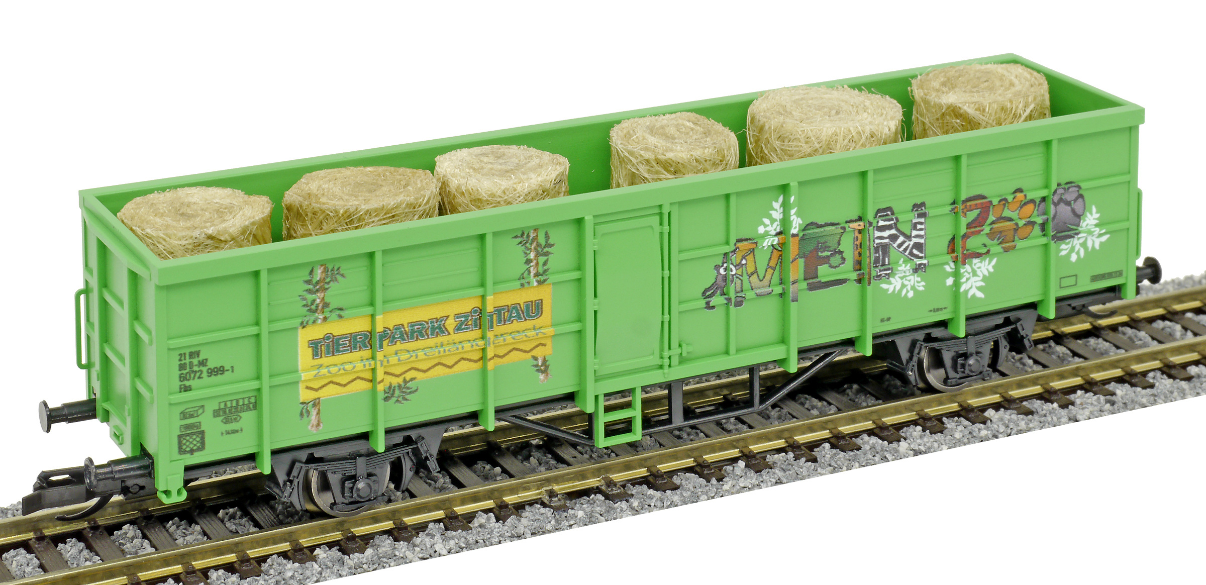 | otevřený nákladní vůz zelený „Mein Zoo“ s nákladem balíků sena |