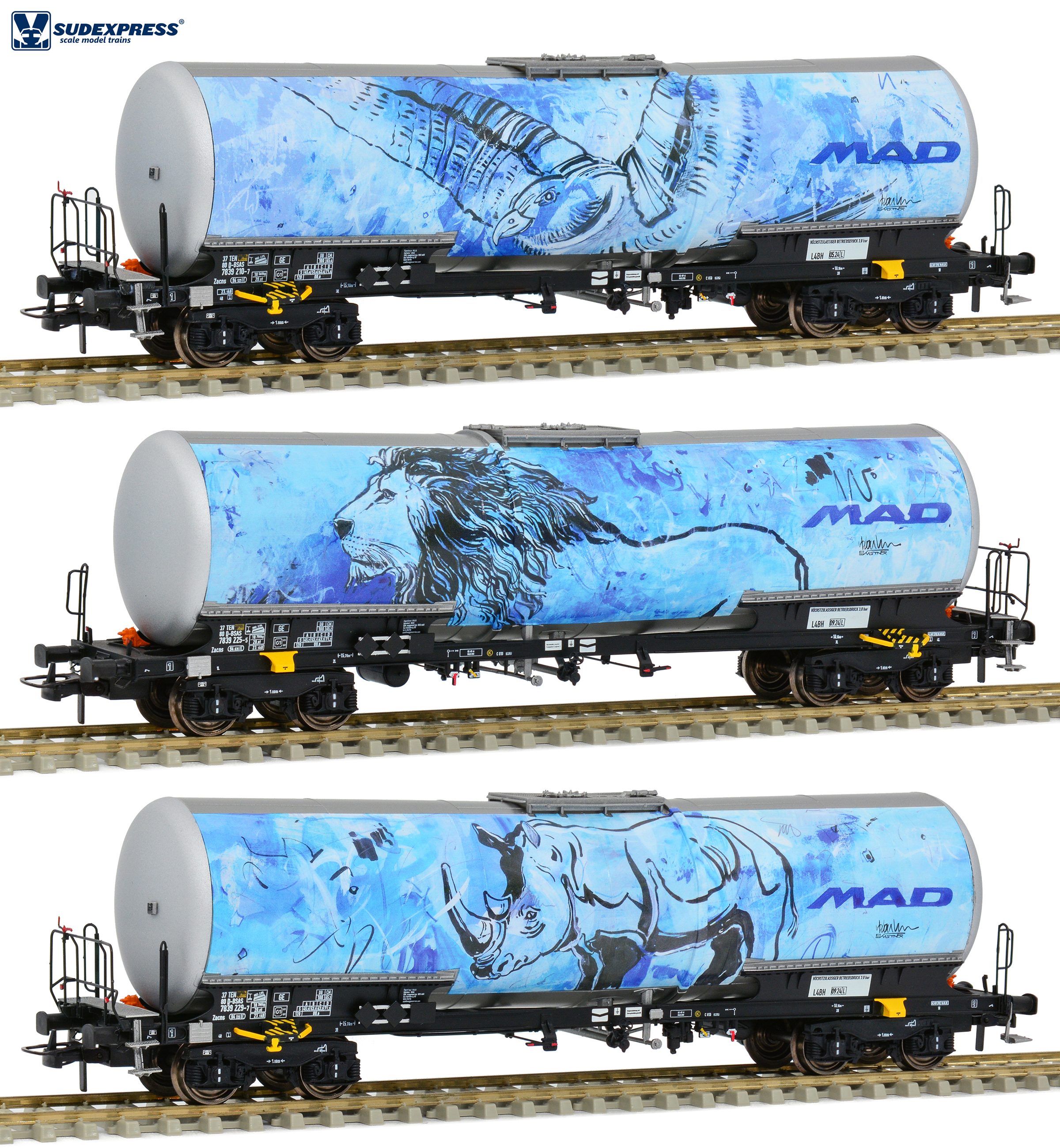 | set tří šedých kotlových vozů s potiskem motivů zvířat |
