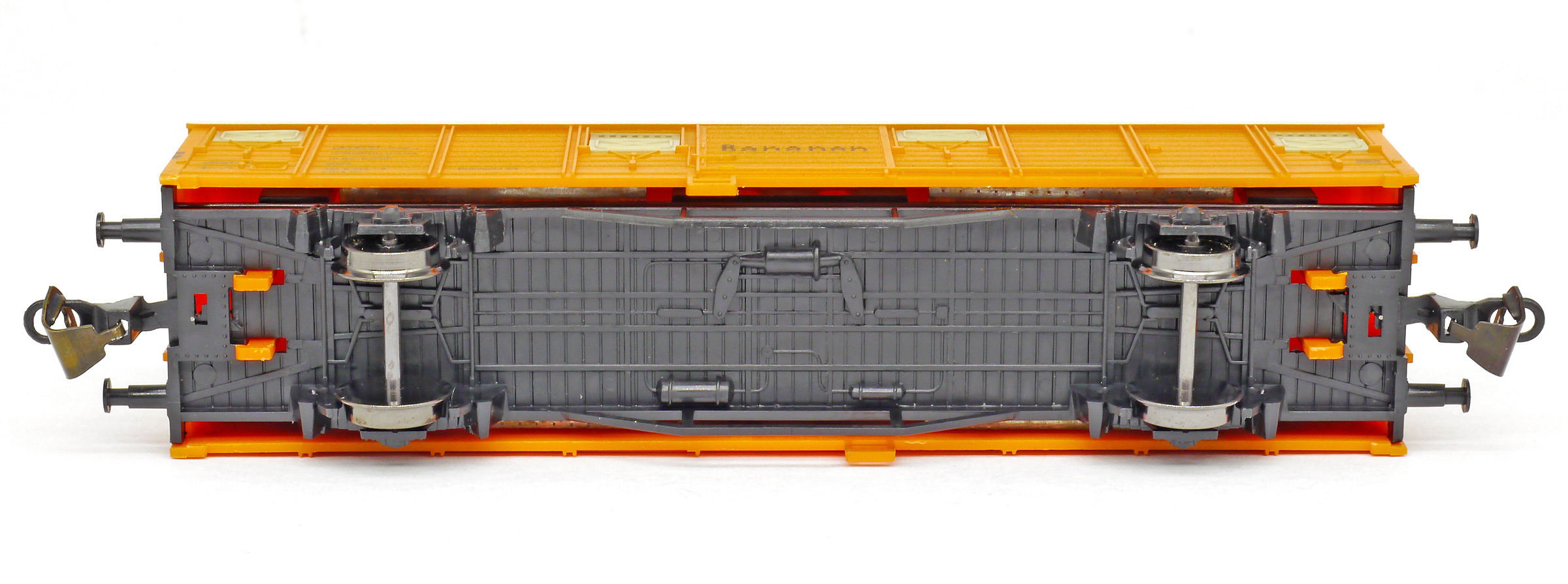 | krytý nákladní vůz oranžový s krémovou střechou a s oranžovými vraty „Bananen“ |