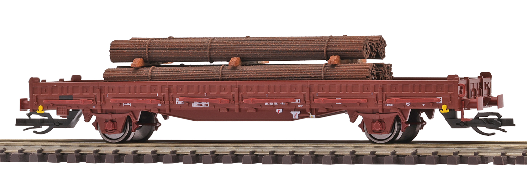 | nízkostěnný nákladní vůz červenohnědý s klanicemi s nákladem ocelových svazků |
