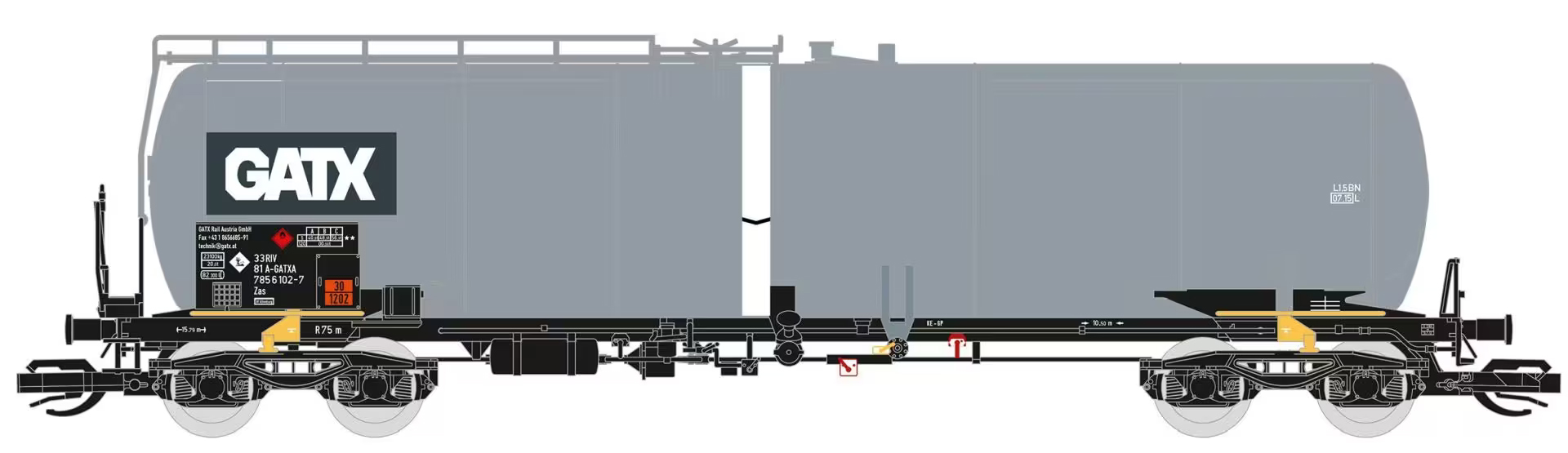 | kotlový vůz na lehké oleje šedý s podélnou lávkou a s brzdařskou plošinou „GATX“ |