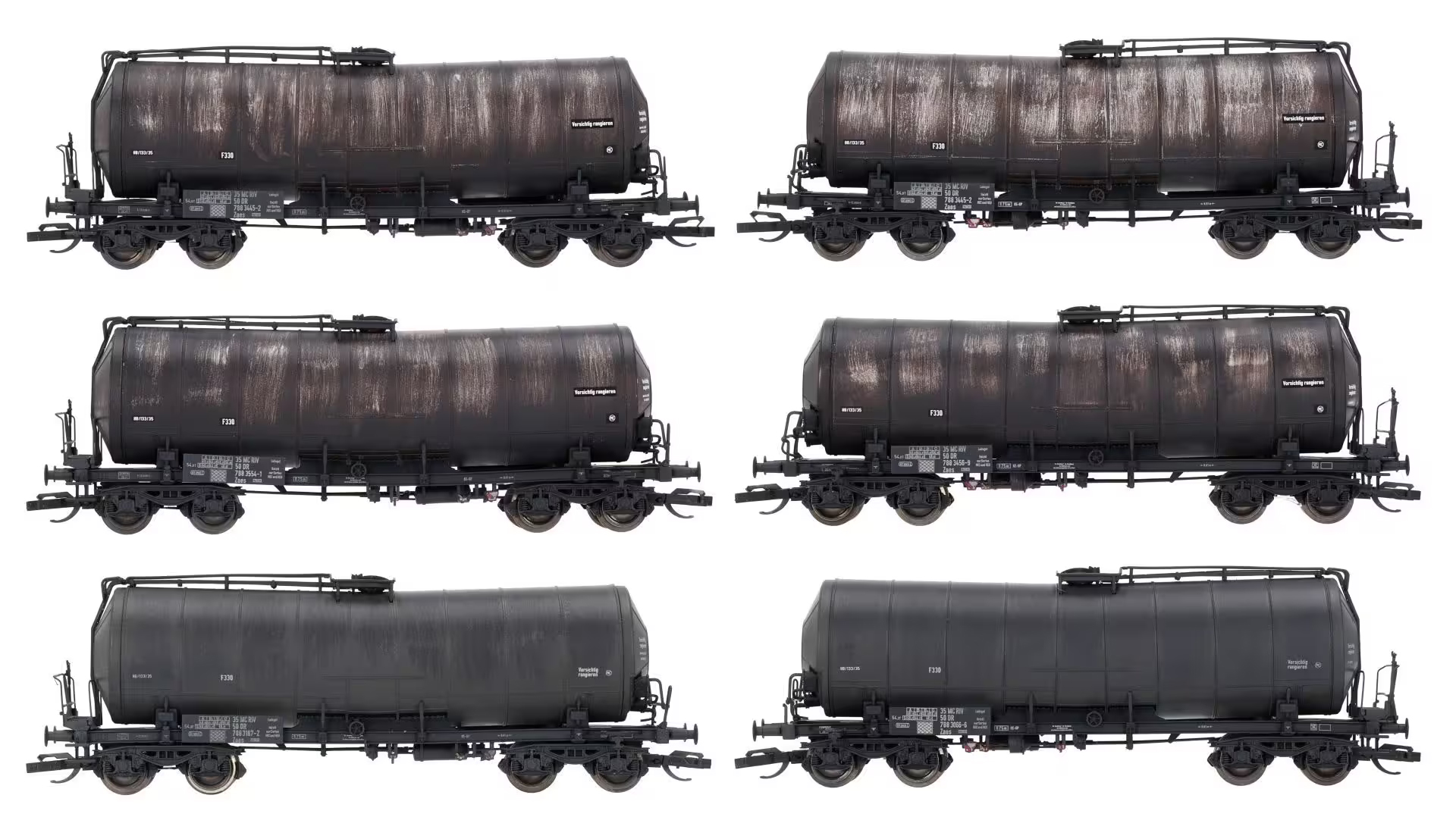| set šesti černých kotlových vozů s různým stupněm patiny |