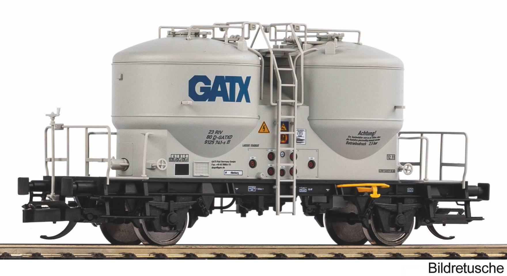 | nákladní samovýsypný nádobový vůz šedý na cement s logem „GATX“ |