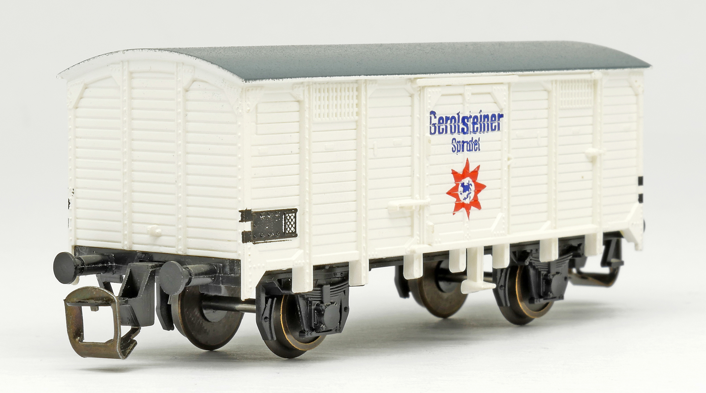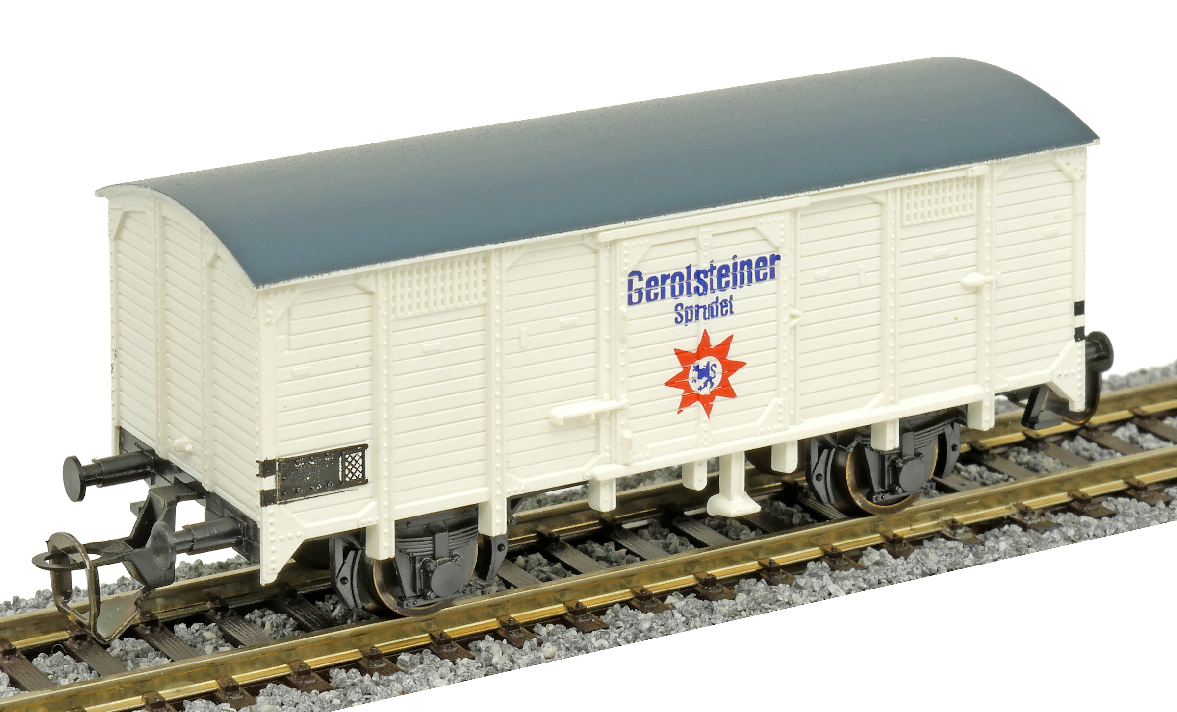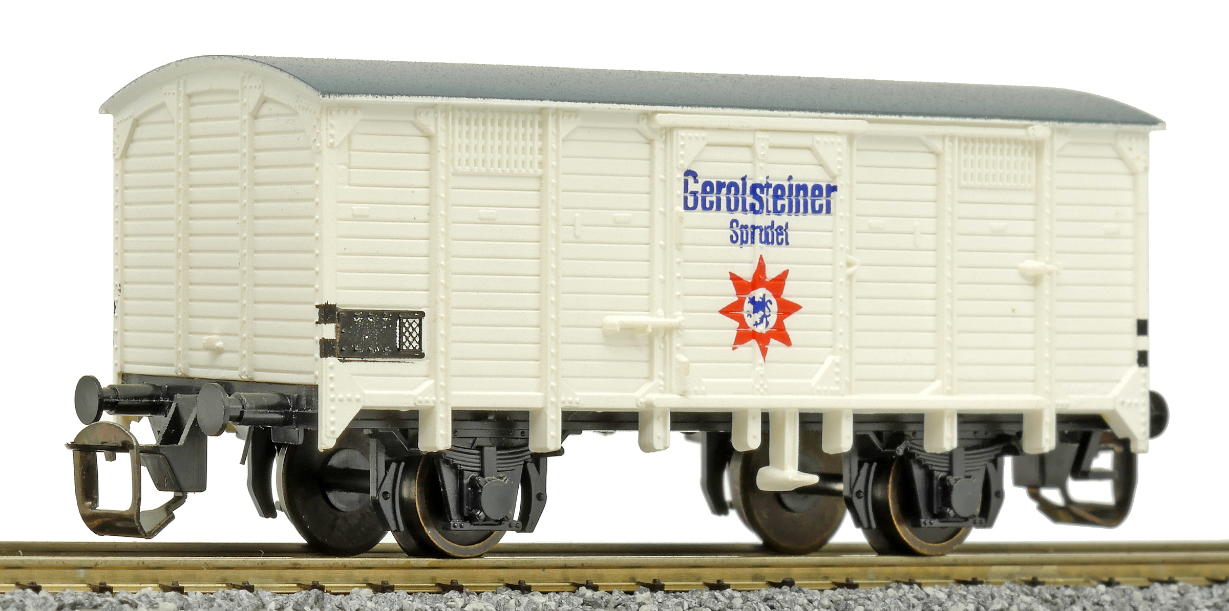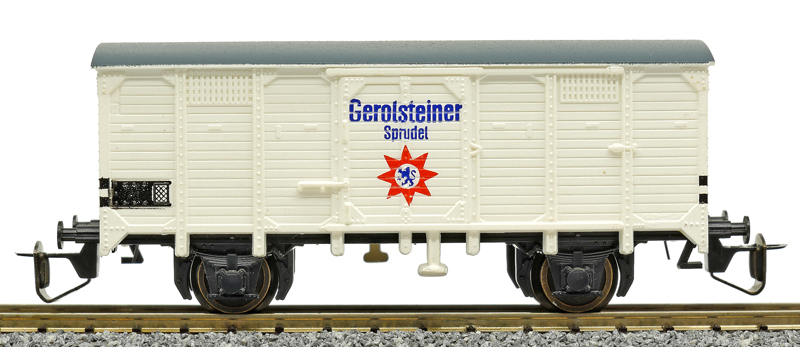 | krytý nákladní vůz bílý s šedou střechou „Gerolsteiner“ |