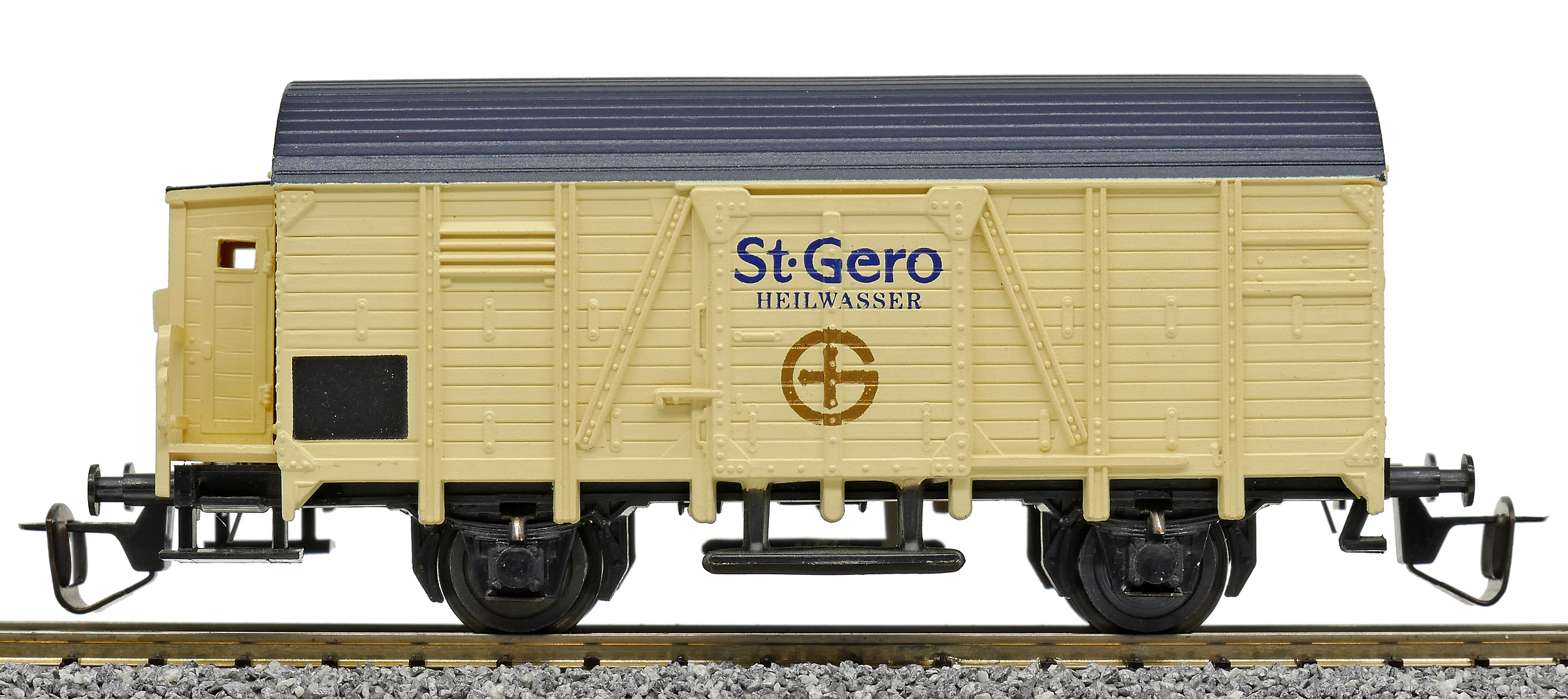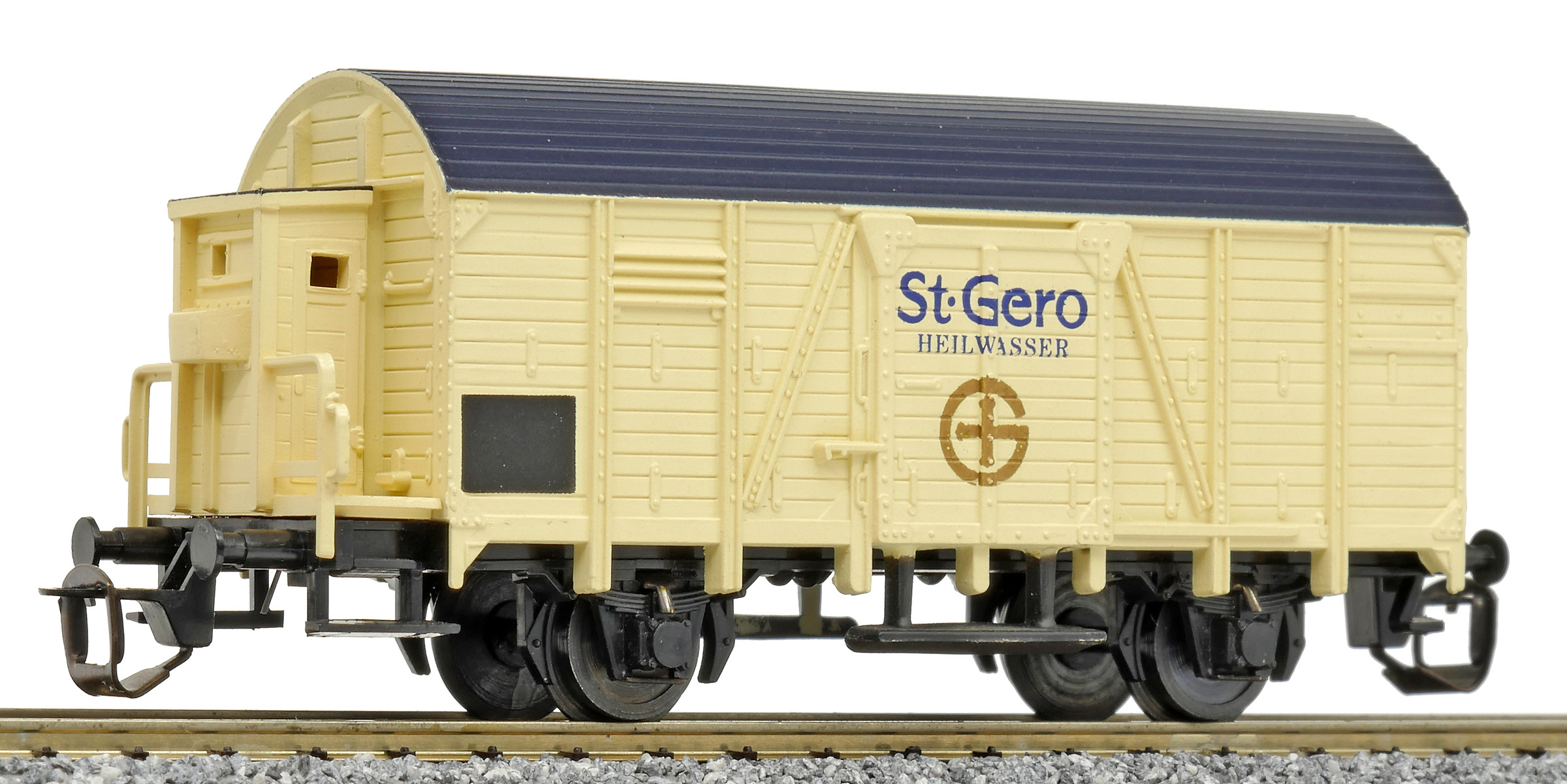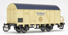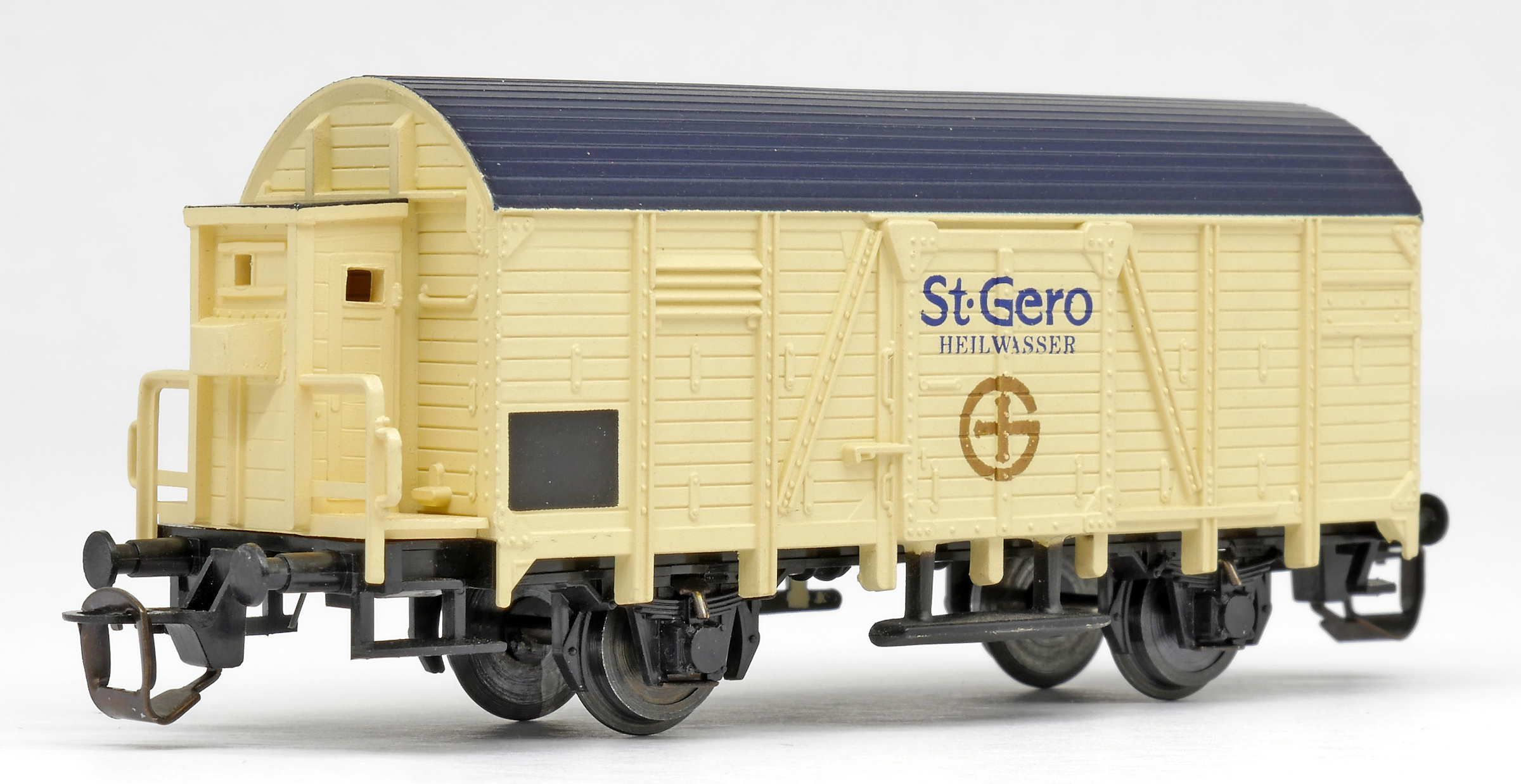 | krytý nákladní vůz krémový s černou střechou a s brzdařskou budkou „St. Gero Heilwasser“ |