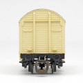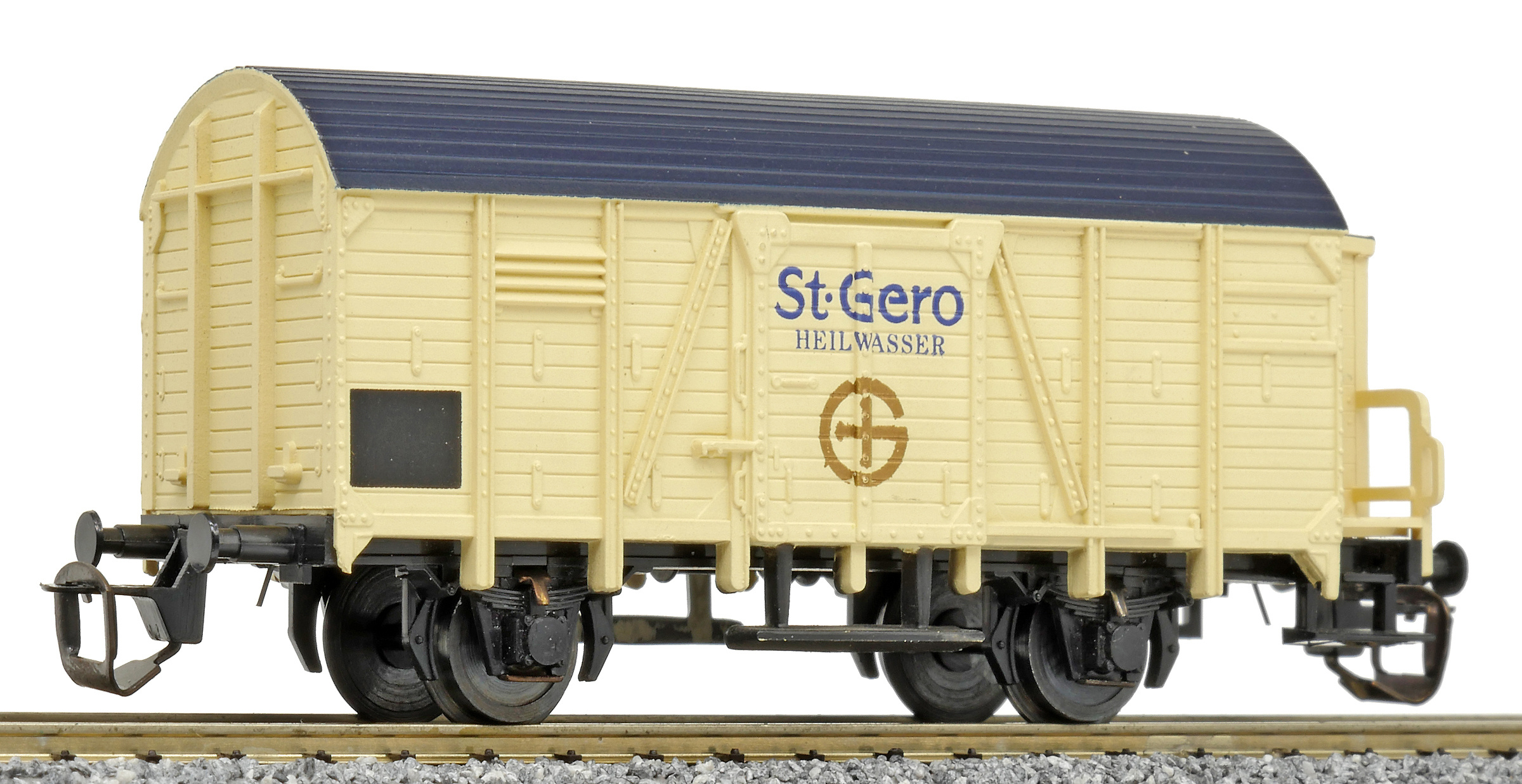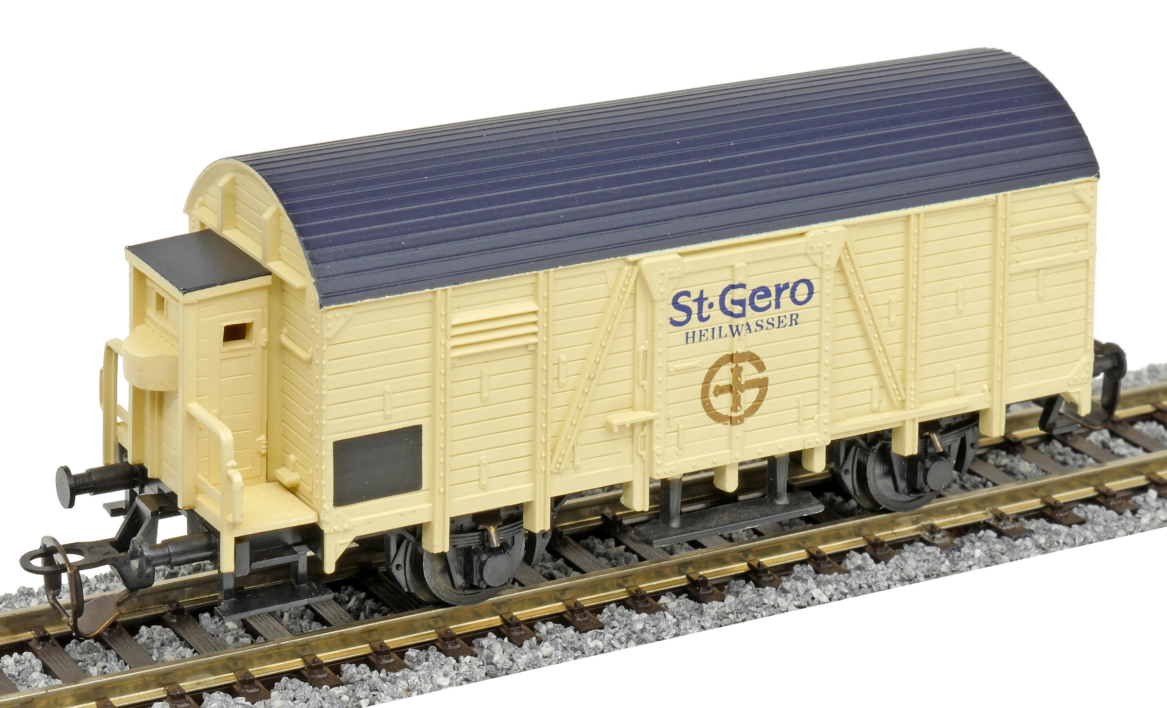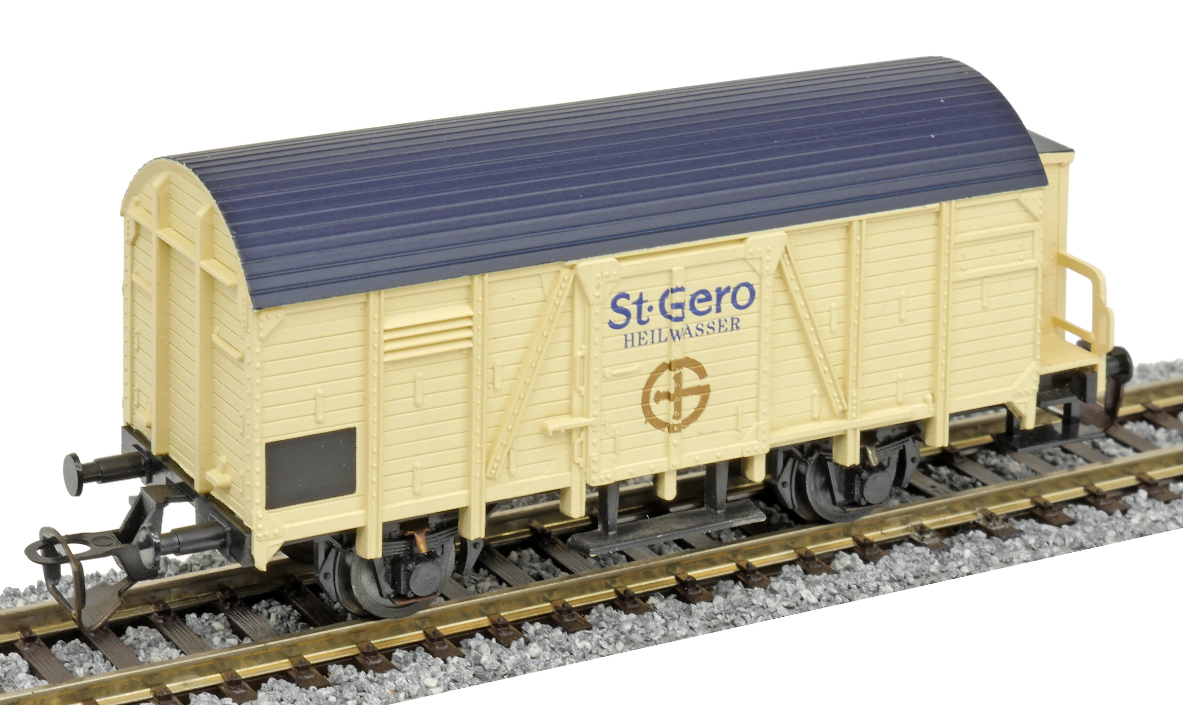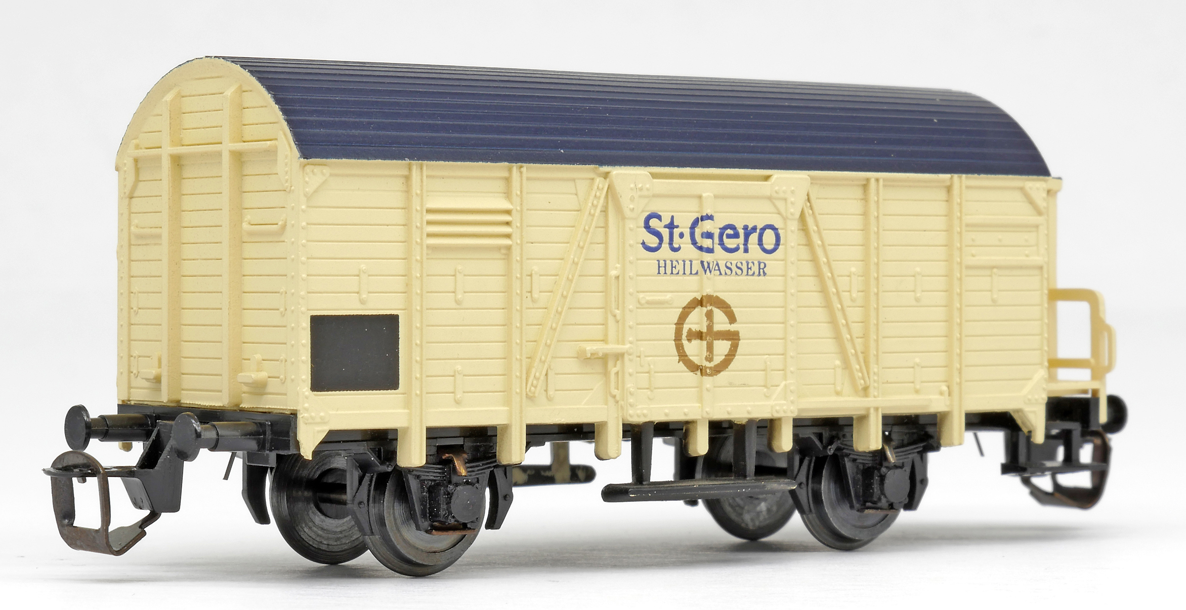 | krytý nákladní vůz krémový s černou střechou a s brzdařskou budkou „St. Gero Heilwasser“ |