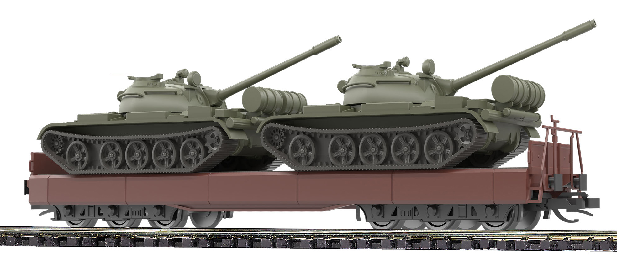 | nízkostěnný nákladní vůz červenohnědý se sklopenými bočnicemi se dvěma taky T-55A |