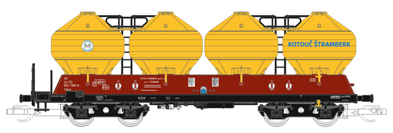 | nákladní samovýsypných nádobový vůz červenohnědý se žlutými nádobami „Kotouč Štramberk“ |