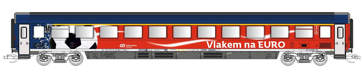 | rychlíkový vůz s reklamním potiskem „Vlakem na EURO“ 1. tř. |