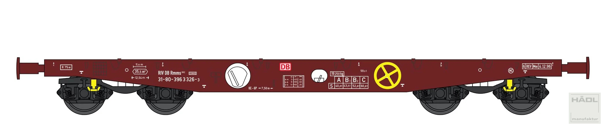 | • Rmms 662 | - | plošinový vůz podvozkový běžné stavby se sklopnými čelními stěnami a klanicemi |