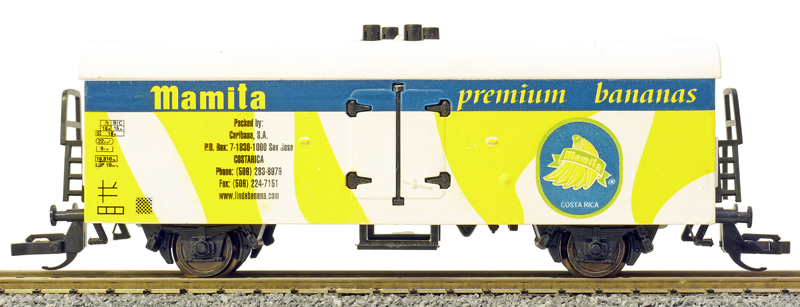 | nákladní chladící vůz s bílou střechou s reklamním potiskem „Mamita premium bananas“ |
