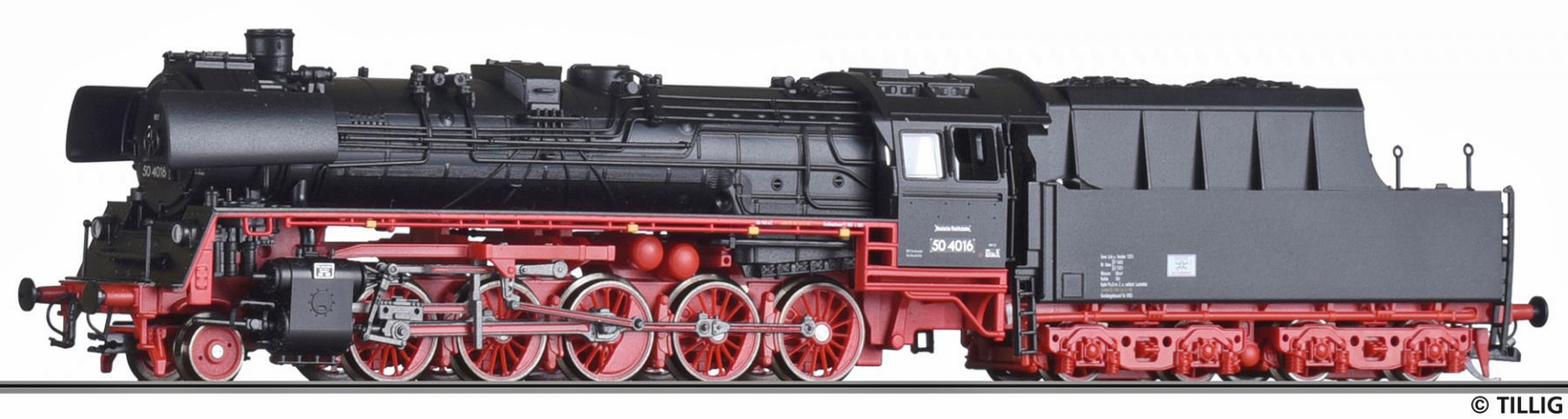 Kód   505001  [Lokomotivy] → [Parní] → [BR 50] → 505001: parní lokomotiva černá s červeným pojezdem a s kouřovými plechy, vanový tendr