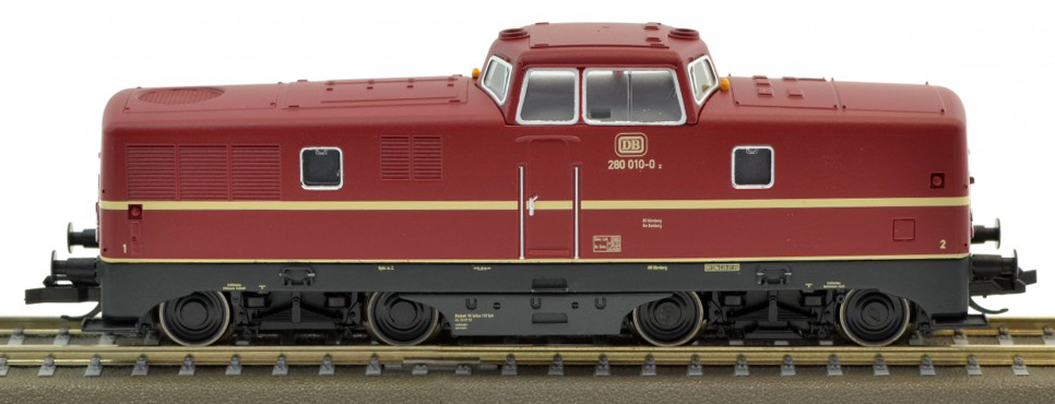 Kód   04803 E  [Lokomotivy] → [Motorové] → [V 80] → 04803 E: dieselová lokomotiva červená s černým rámem a pojezdem