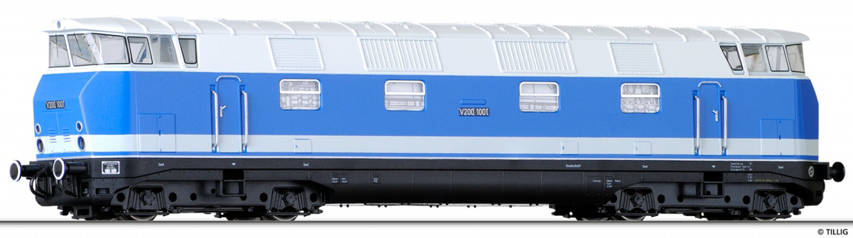 | dieselová lokomotiva modrá-slonová kost s černým pojezdem |