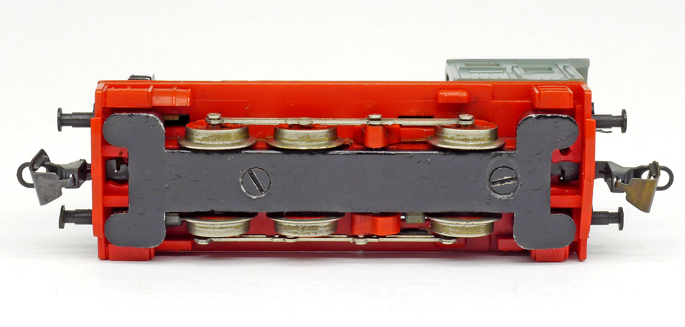 Kód   04643 E  [Lokomotivy] → [Motorové] → [V 36] → 04643 E: dieselová lokomotiva černá s šedou střechou, červený rám a pojezd