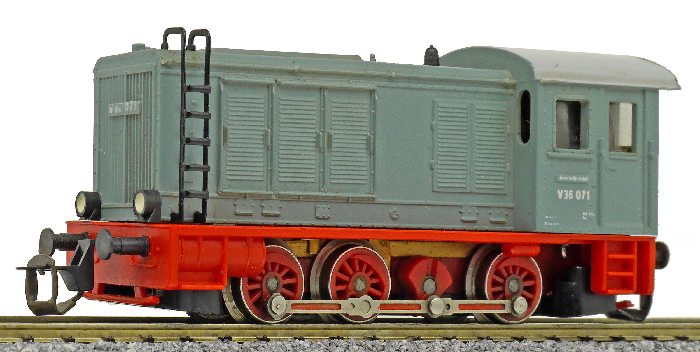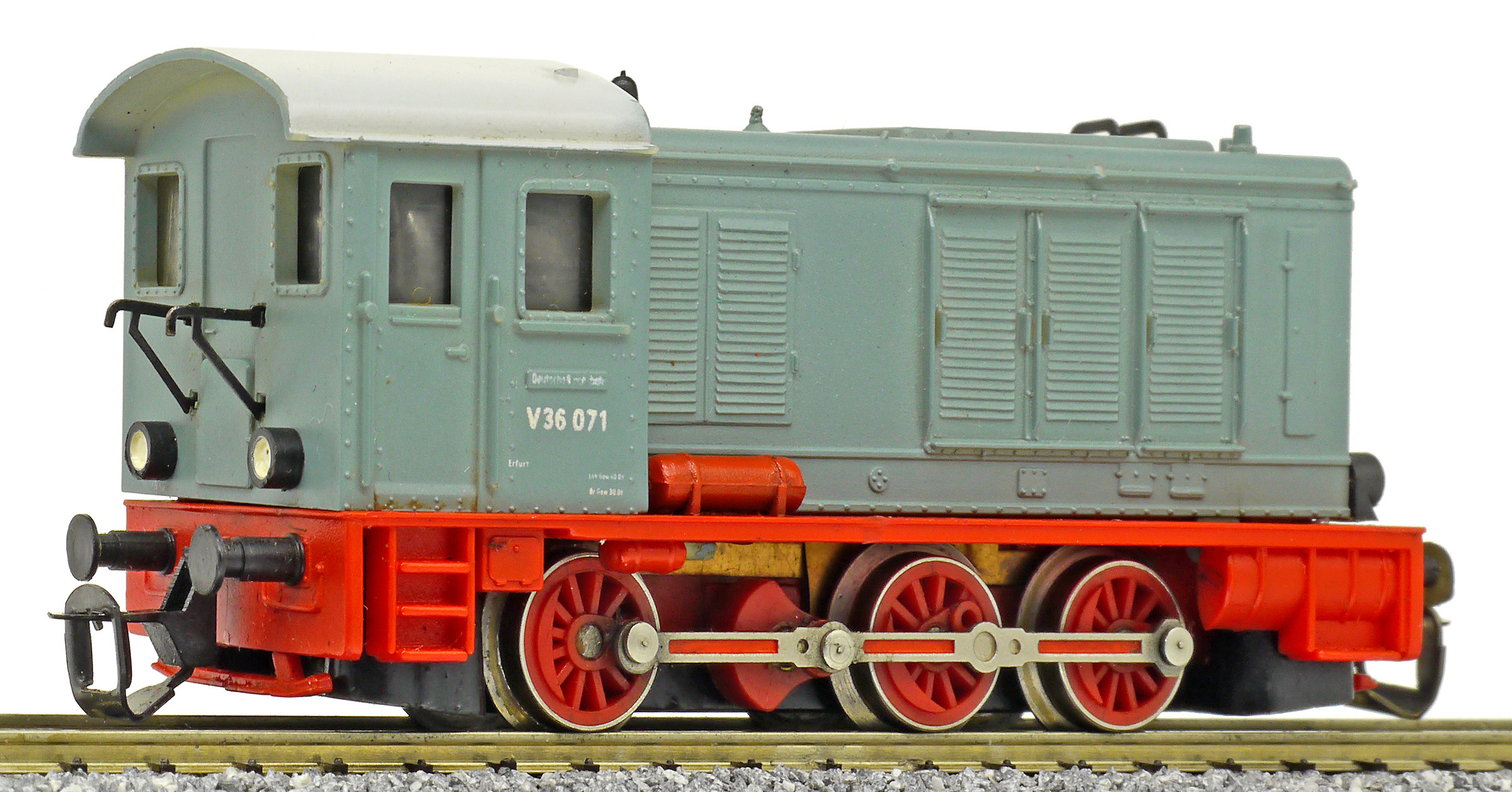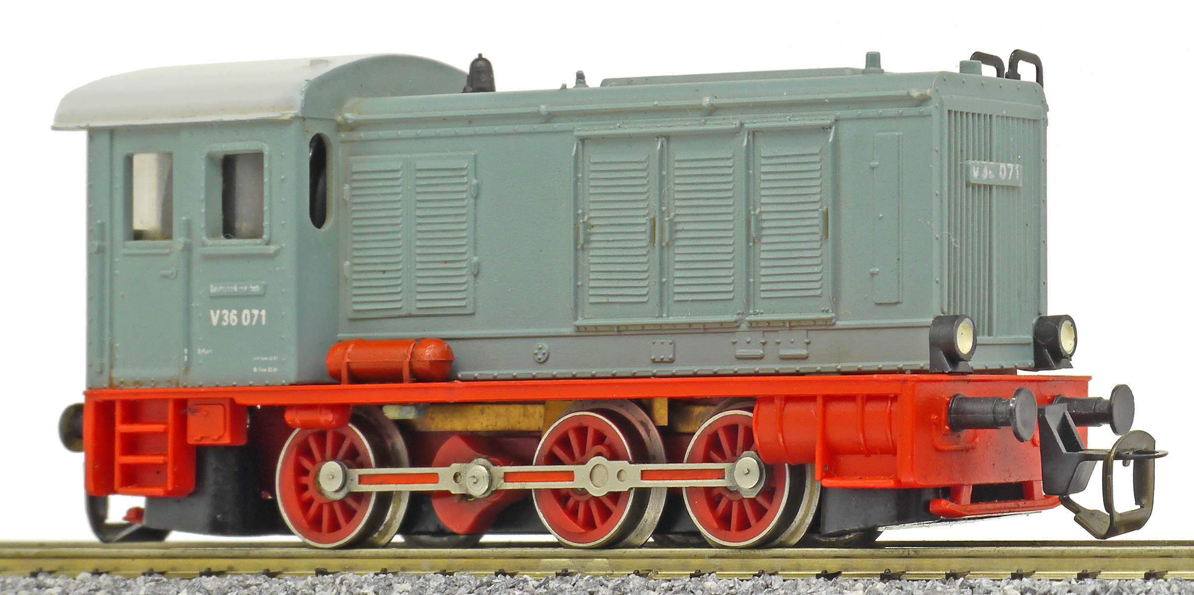 Kód   02601  [Lokomotivy] → [Motorové] → [V 36] → 02601: dieselová lokomotiva zelená s černým rámem, červená kola „Leuna Werke“