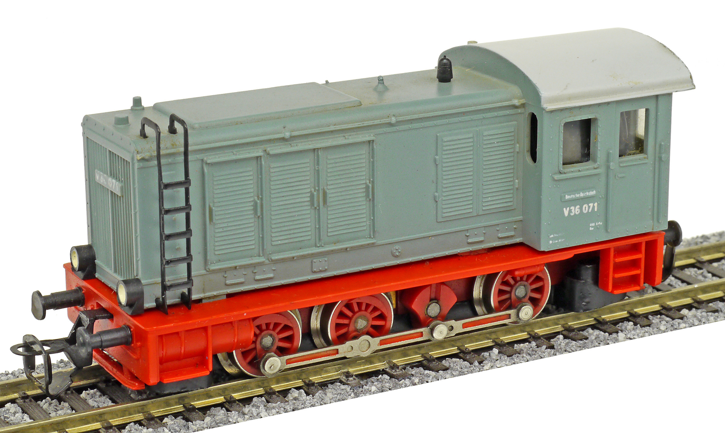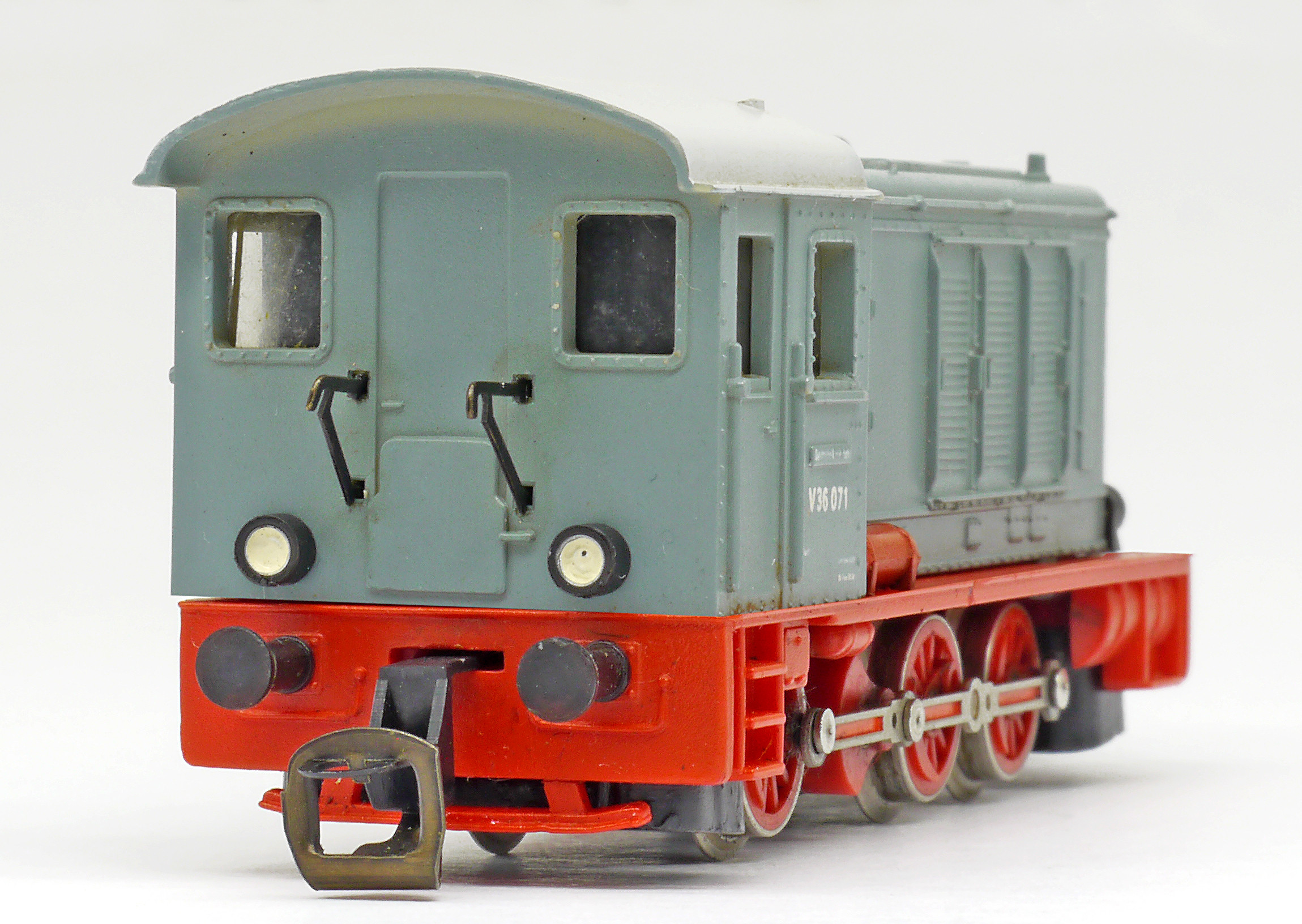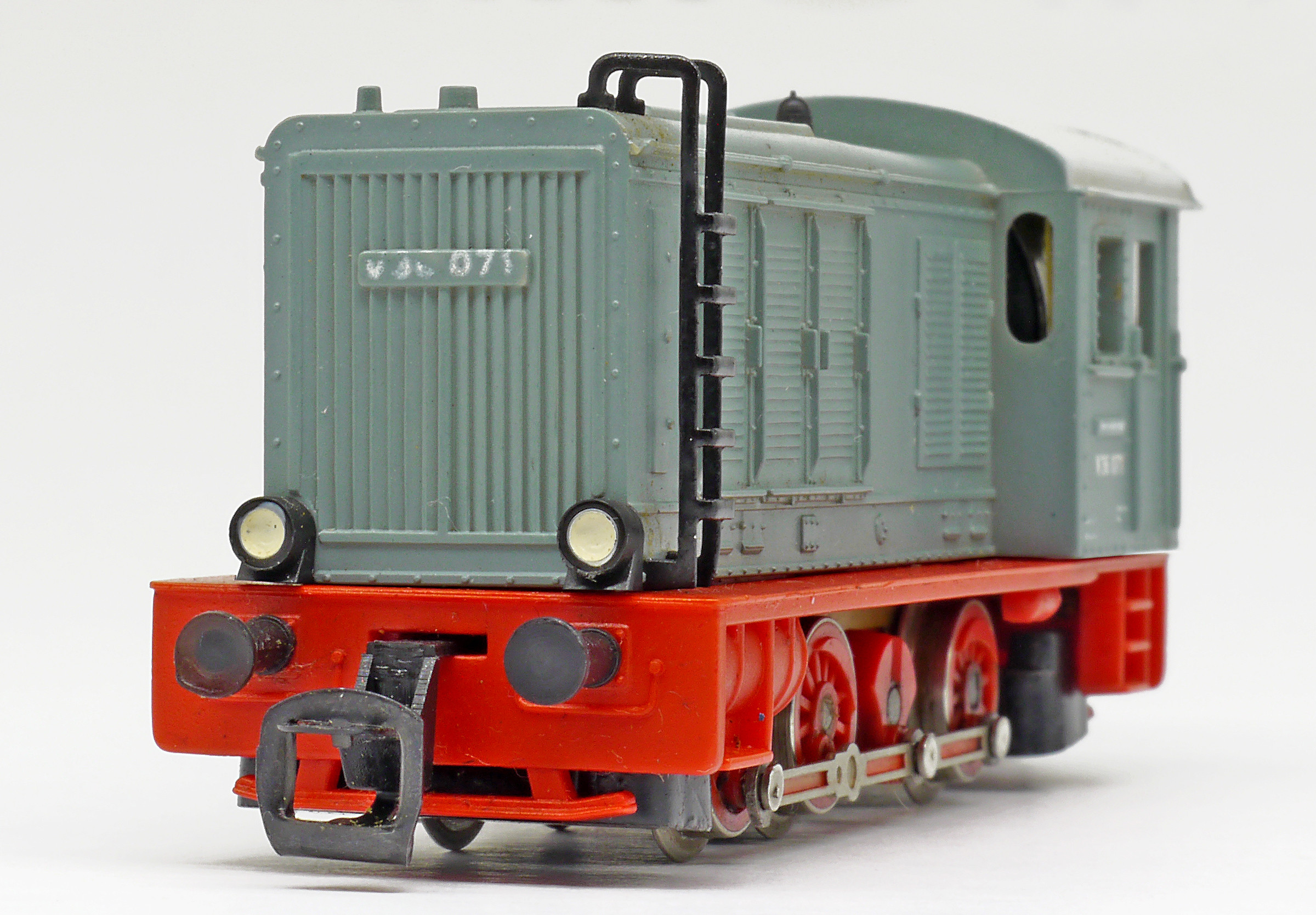 Kód   02601  [Lokomotivy] → [Motorové] → [V 36] → 02601: dieselová lokomotiva zelená s černým rámem, červená kola „Leuna Werke“