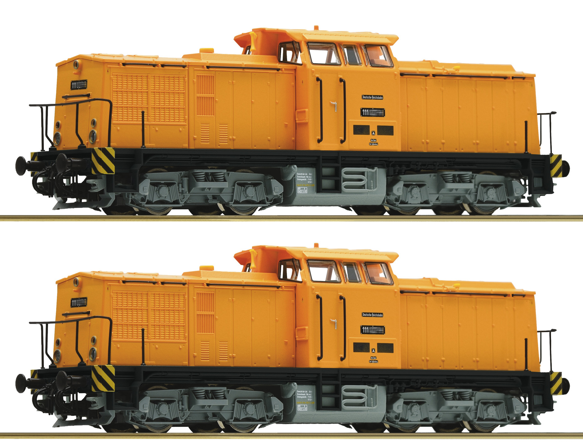 | set dvou dieselových lokomotiv v barvě oranžová, černý rám a šedý pojezd |