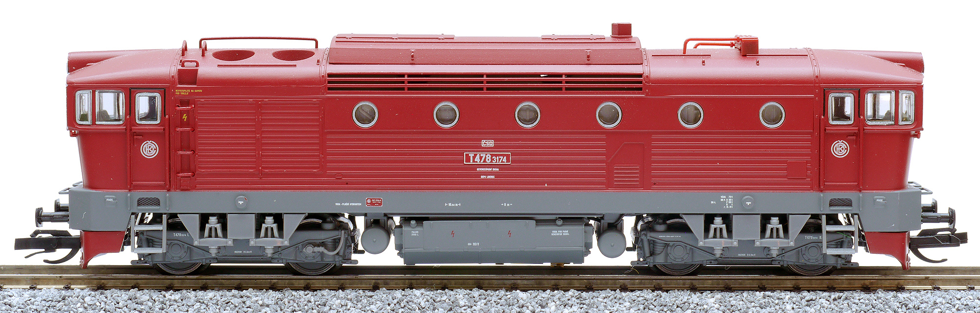 Kód   TT750_073  [Lokomotivy] → [Motorové] → [T478.3 „Brejlovec”] → TT750_073: dieselová lokomotiva červená s výstražným pruhem, šedá střecha, rám a pojezd