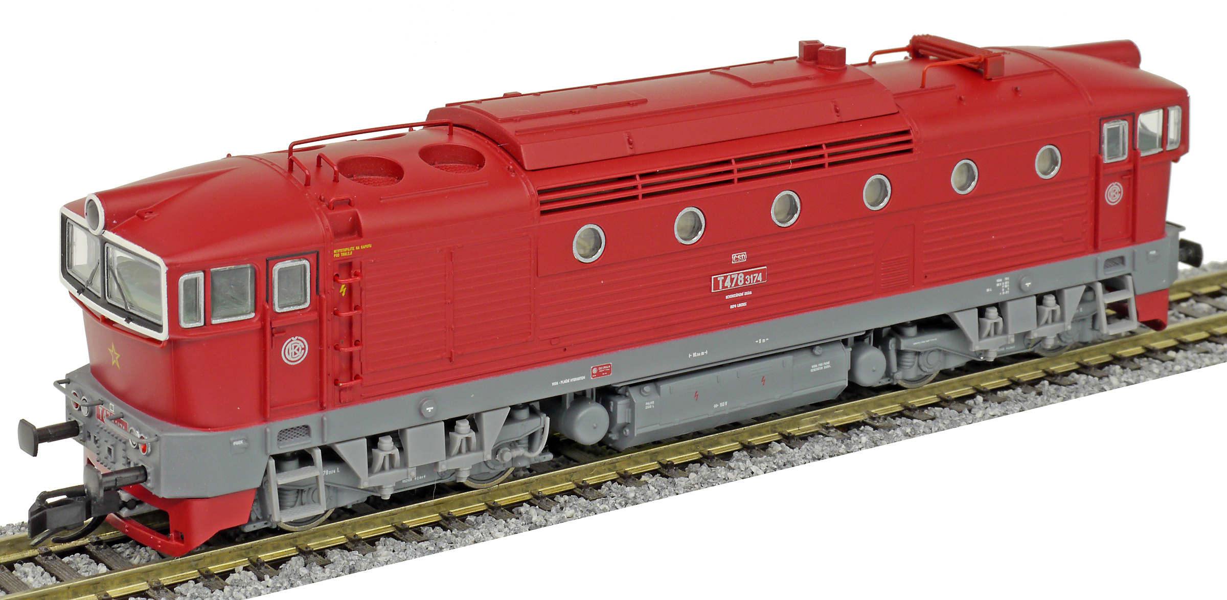 Kód   CD-754-025  [Lokomotivy] → [Motorové] → [T478.3 „Brejlovec”] → CD-754-025: dieselová lokomotiva červená s výstražným pruhem, šedé podvozky