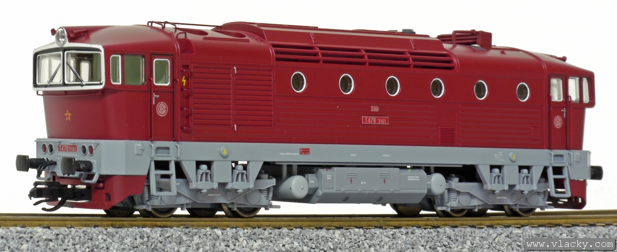 Kód   TT750-088  [Lokomotivy] → [Motorové] → [T478.3 „Brejlovec”] → TT750-088: dieselová lokomotiva vínově červená s výstražným pásem, šedé podvozky