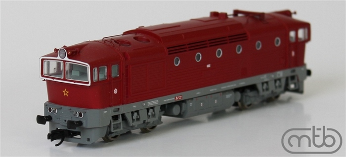 Kód   TT750-088  [Lokomotivy] → [Motorové] → [T478.3 „Brejlovec”] → TT750-088: dieselová lokomotiva vínově červená s výstražným pásem, šedé podvozky
