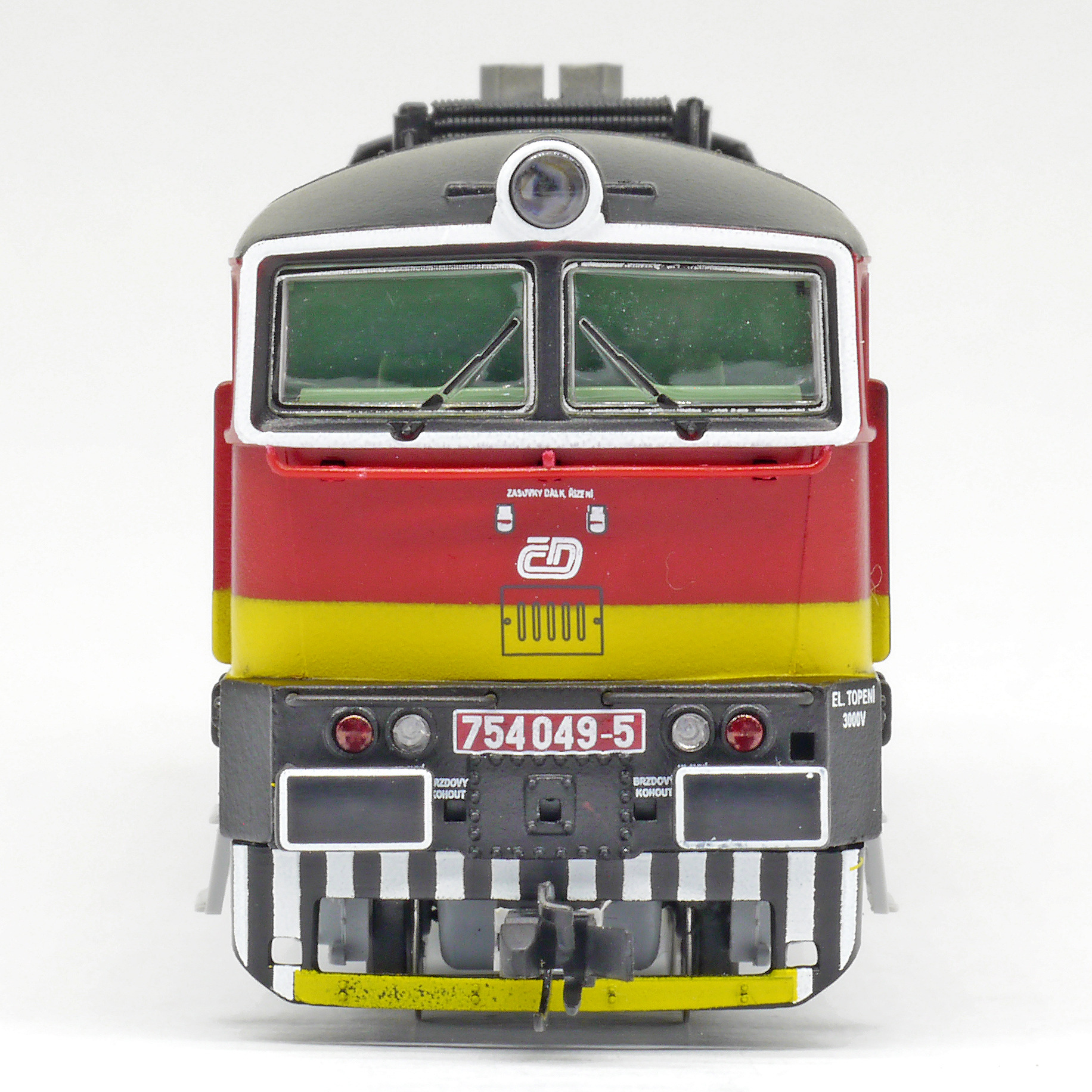 Kód   CD 754 049  [Lokomotivy] → [Motorové] → [T478.3 „Brejlovec”] → CD 754 049: dieselová lokomotiva červená se žlutými blesky, tmavě šedá střecha, rám a pojezd