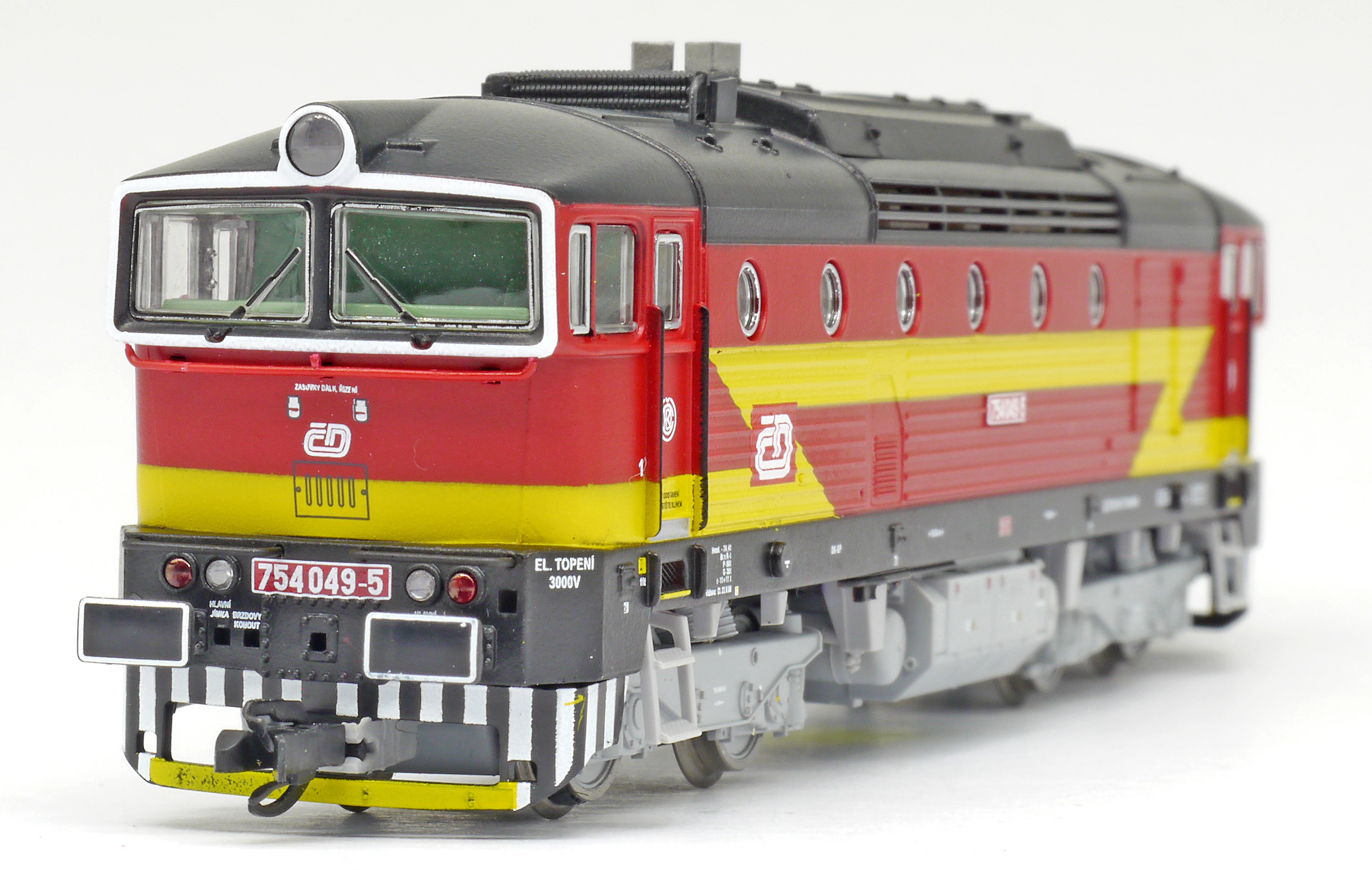 Kód   CD-754-025  [Lokomotivy] → [Motorové] → [T478.3 „Brejlovec”] → CD-754-025: dieselová lokomotiva červená s výstražným pruhem, šedé podvozky