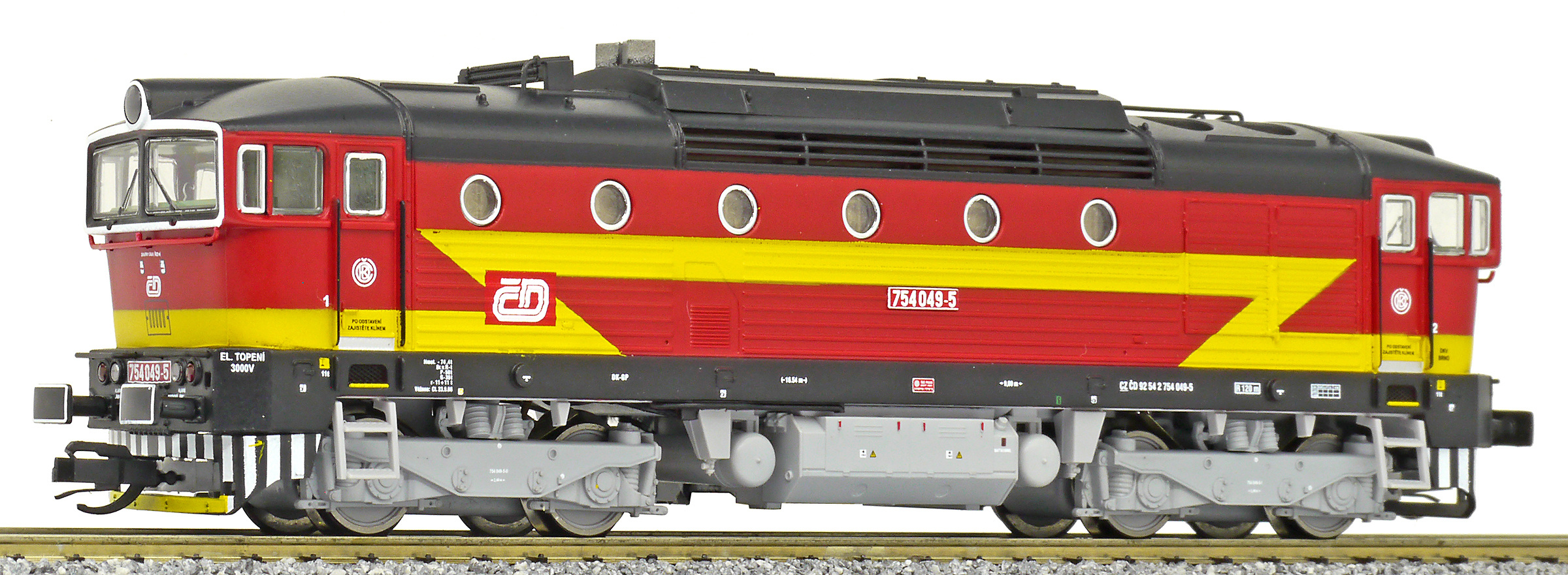 Kód   CD 754 049  [Lokomotivy] → [Motorové] → [T478.3 „Brejlovec”] → CD 754 049: dieselová lokomotiva červená se žlutými blesky, tmavě šedá střecha, rám a pojezd