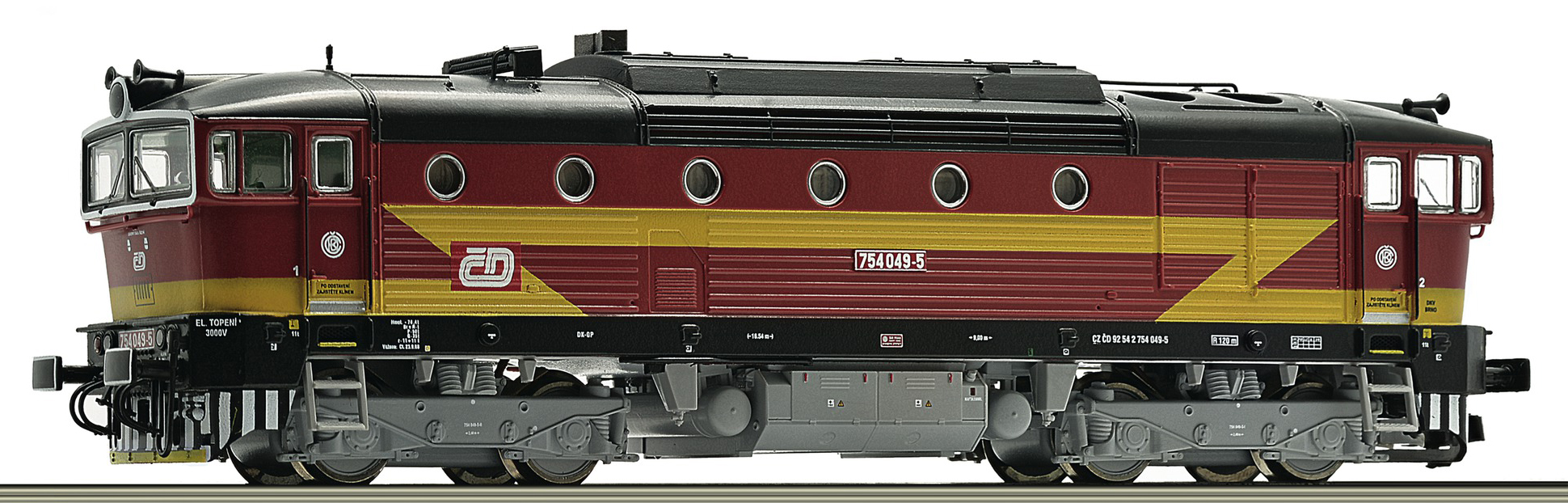 Kód   CD-754-025  [Lokomotivy] → [Motorové] → [T478.3 „Brejlovec”] → CD-754-025: dieselová lokomotiva červená s výstražným pruhem, šedé podvozky
