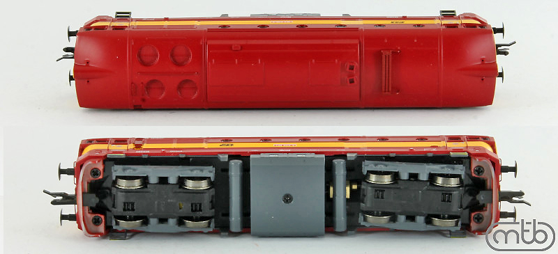 Popis   dieselová lokomotiva červená s výstražným pruhem, šedé podvozky