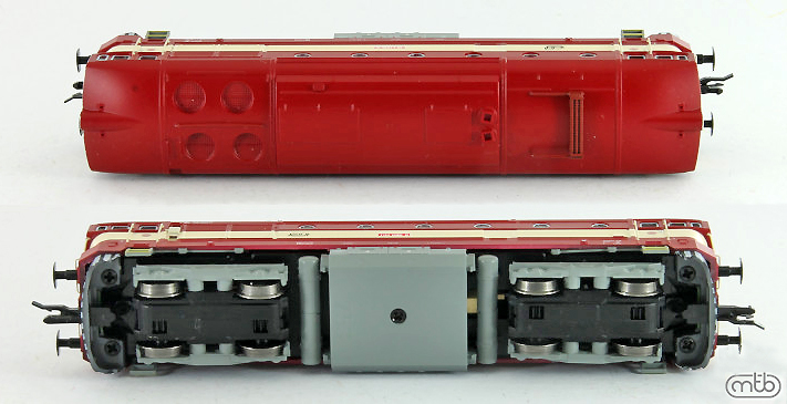 Popis   dieselová lokomotiva vínově červená s krémovým pásem, šedé podvozky