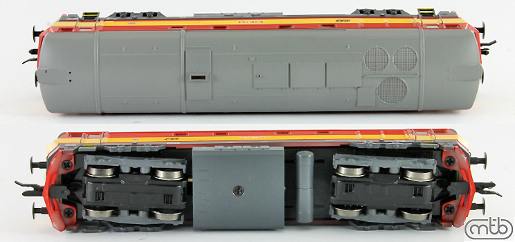 Kód   33439A  [Lokomotivy] → [Motorové] → [T478.1 „Bardotka”] → 33439A: dieselová lokomotiva červená s výstražným žlutým proužkem, šedá střecha