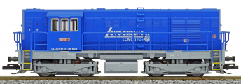 | dieselová lokomotiva modrá s šedým rámem a pojezdem „Lovochemie“ |